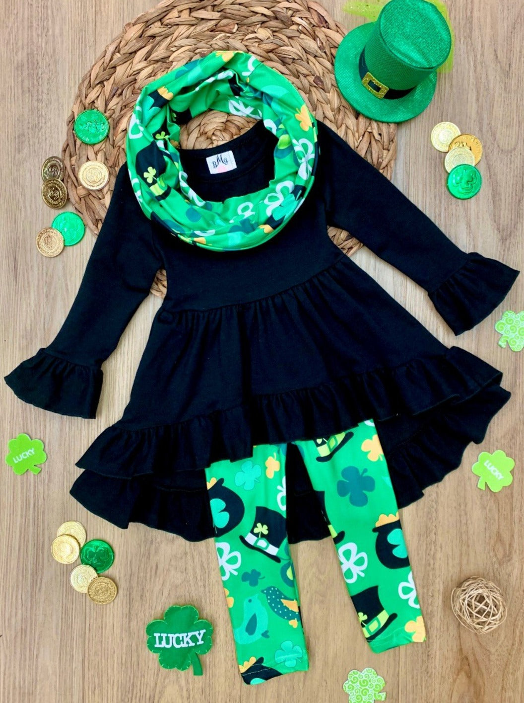 • Let's look for leprechauns and wish for a happy St. Patrick's Day in this chic and stylish three-piece tunic, scarf, and leggings set. The sophisticated black hi-lo tunic with ruffle cuffs looks incredible when paired with the leprechaun buckle hat print that covers the matching leggings and infinity wrap scarf.