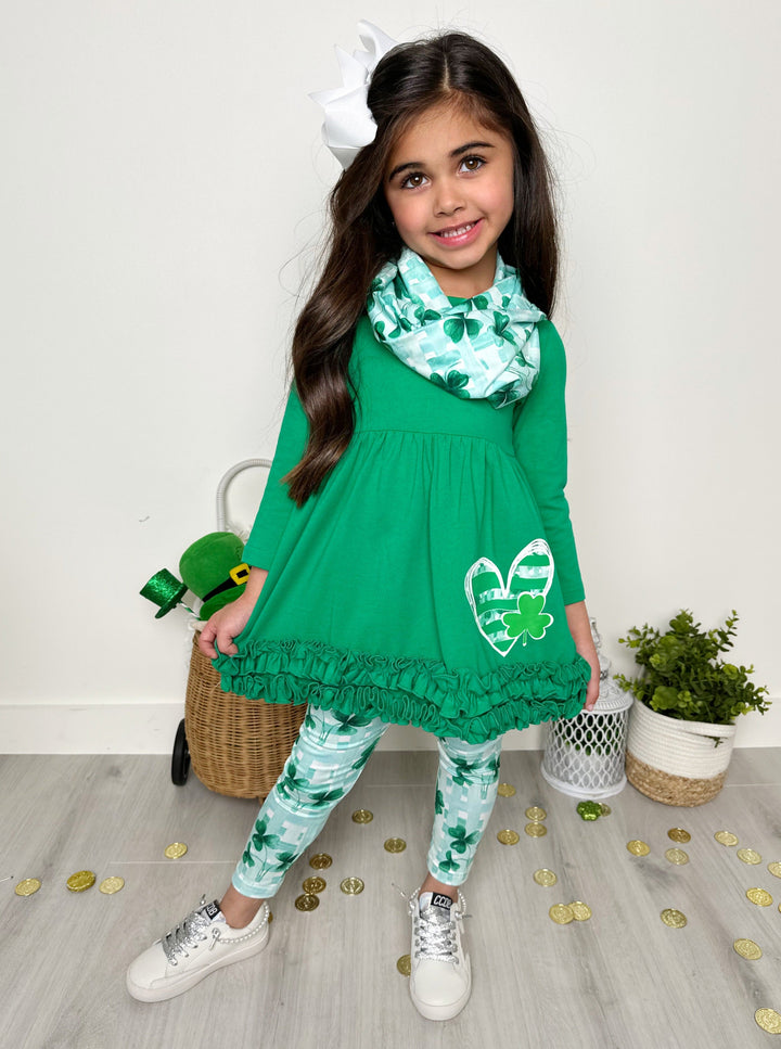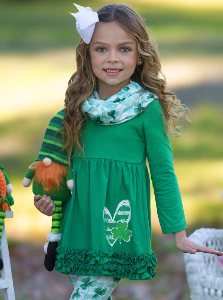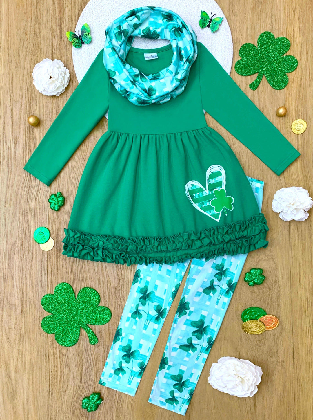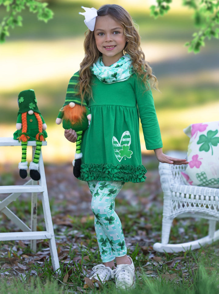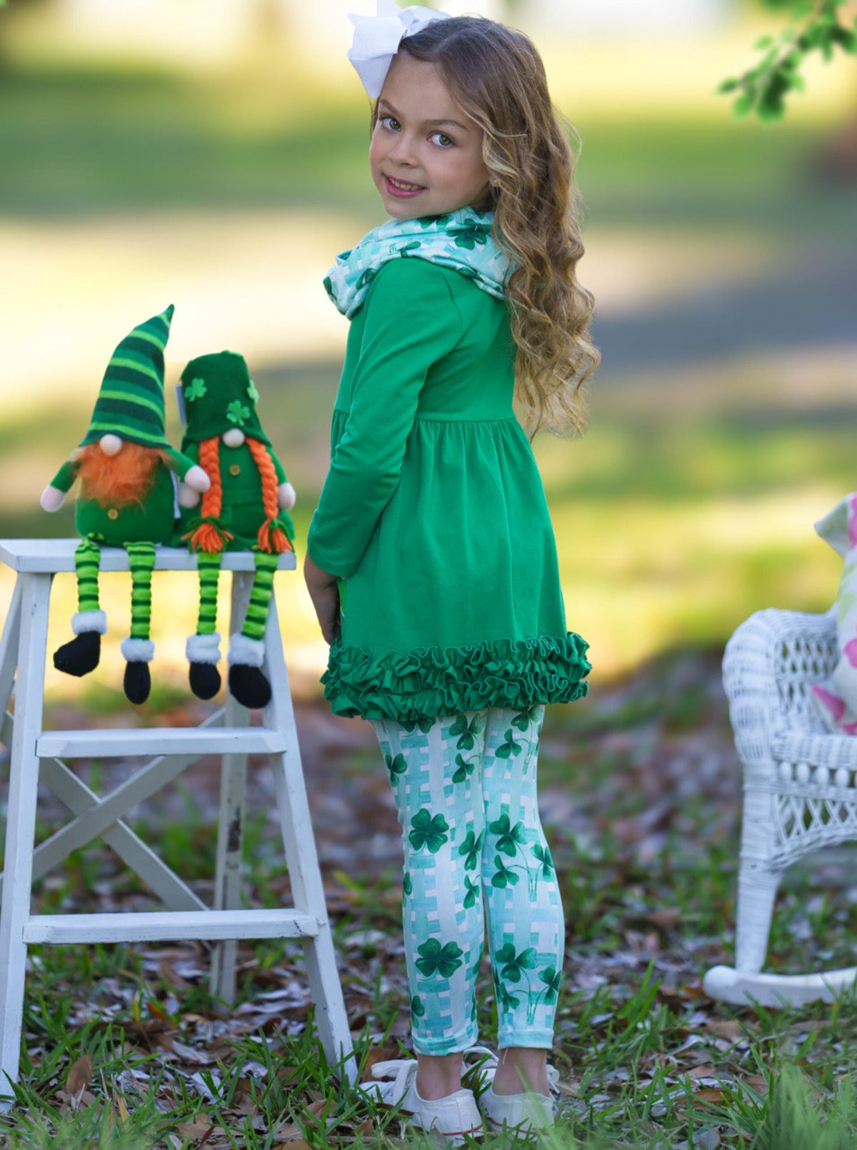 • Set includes a green tunic with ruffle details, clover-print leggings, and matching clover-print scarf