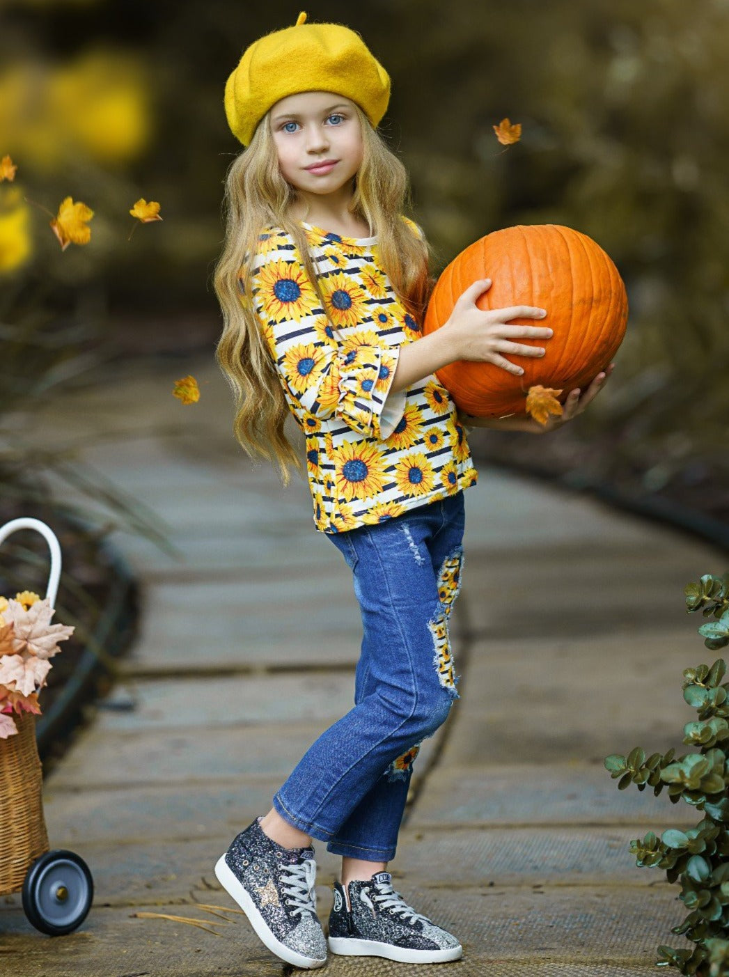 • Here comes the sun! No wait, it's your precious girl in this chic sunflower patched jeans set. Brightly colored with trendy stripes and ruffle, she won't be able to resist!
