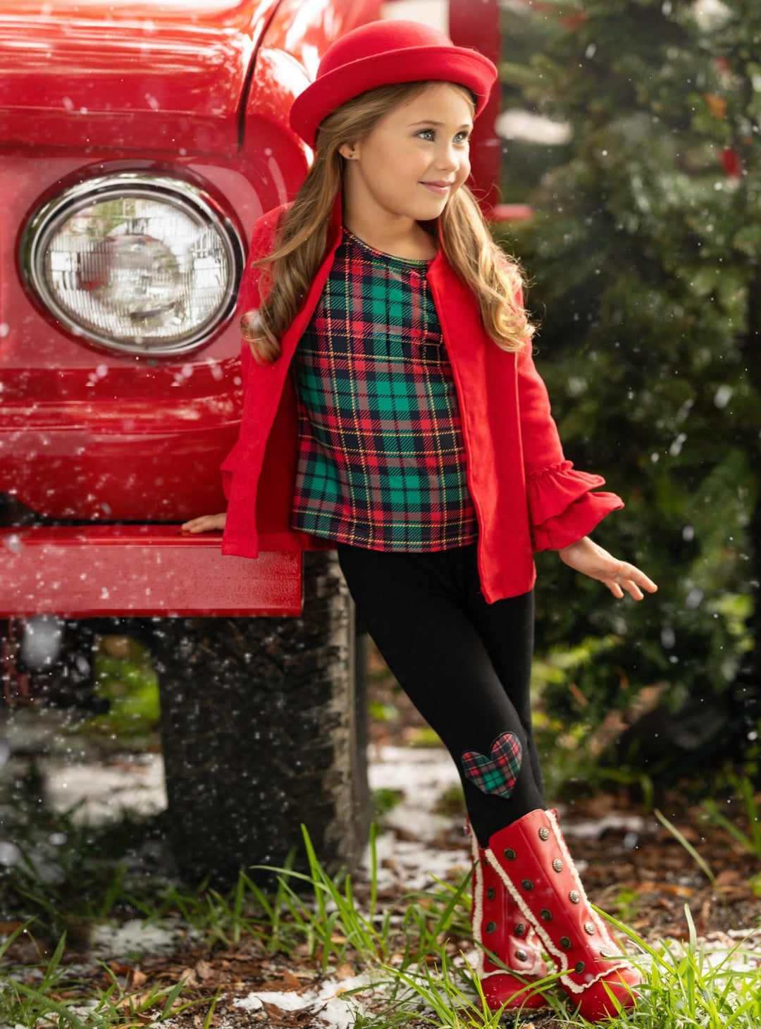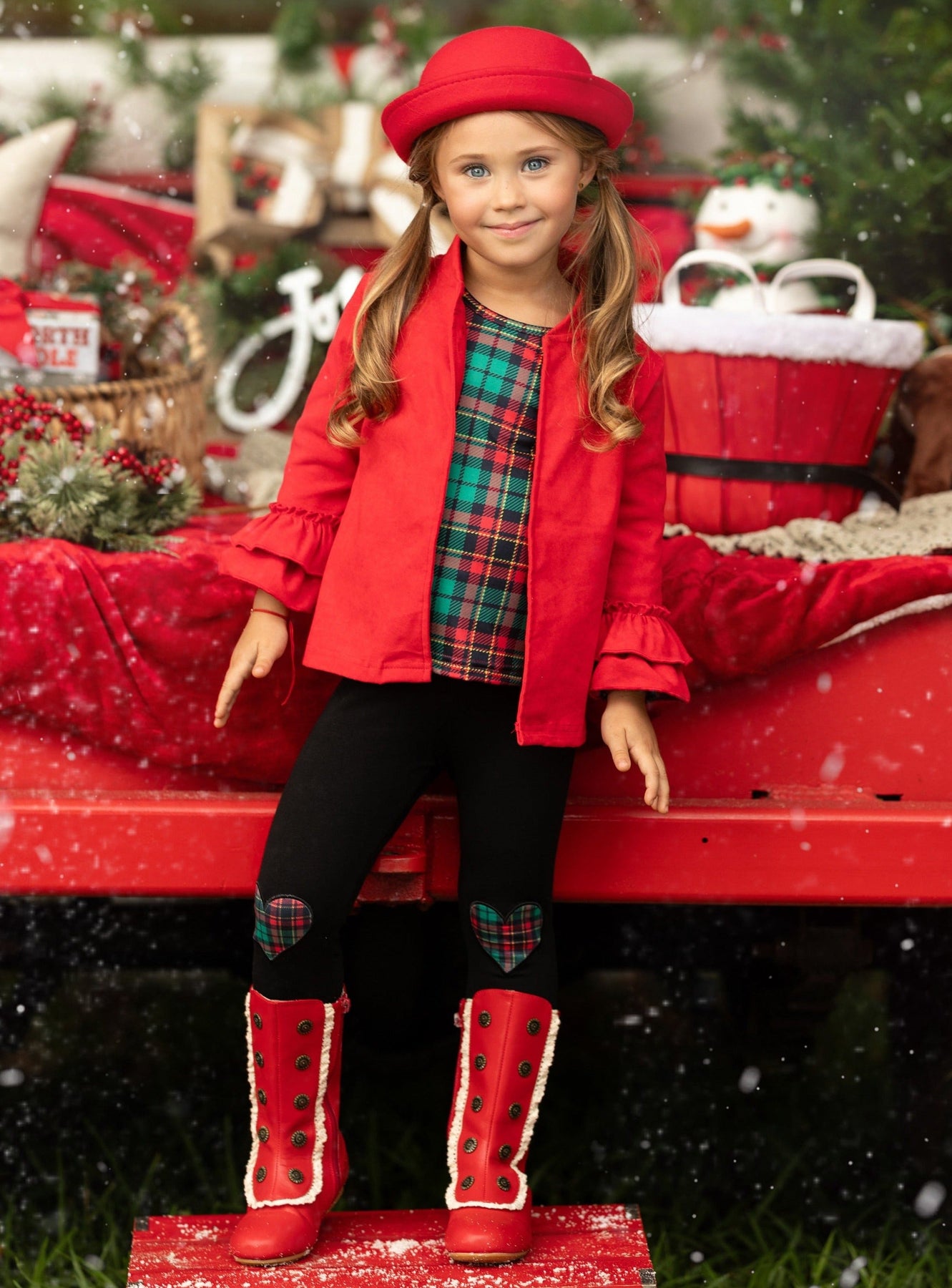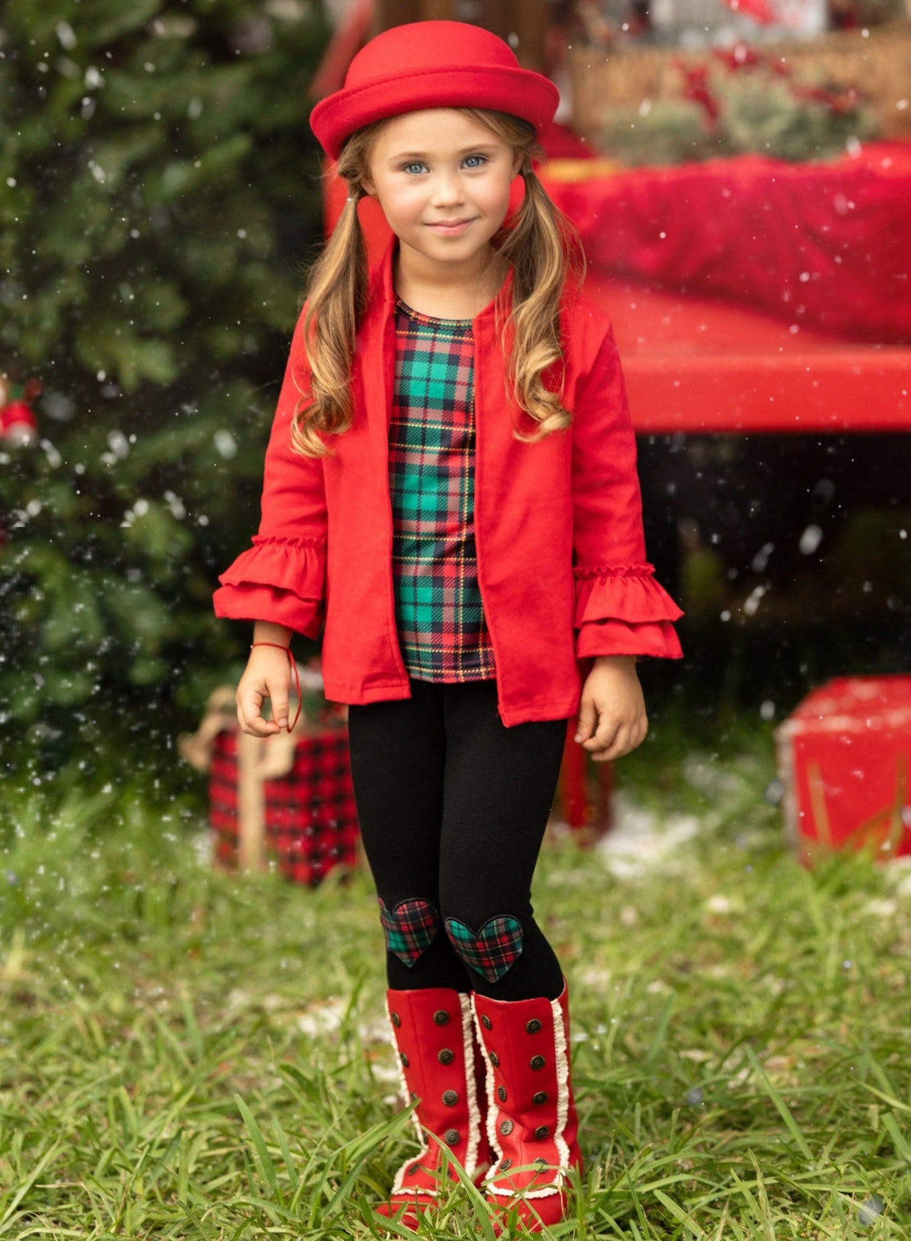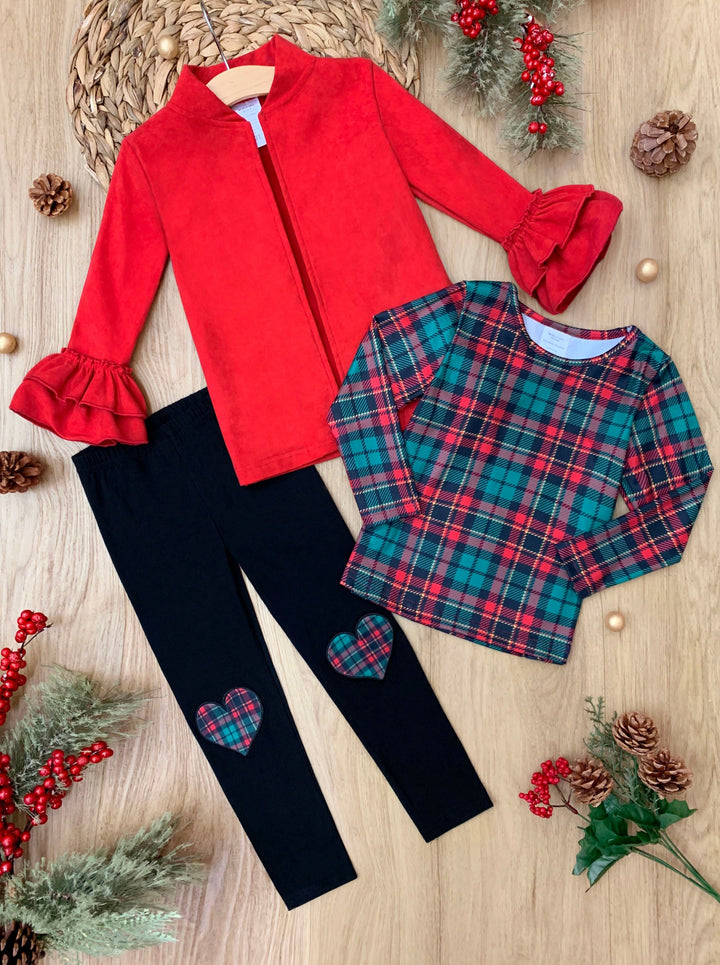 - It's the best time to be jolly and bright, so dress her up in the most festive top, cardigan, and leggings set! Featuring a plaid top, ruffled cardigan, and plaid patch leggings, this trio will spark her festive spirit so she can feel the magic of the holidays!