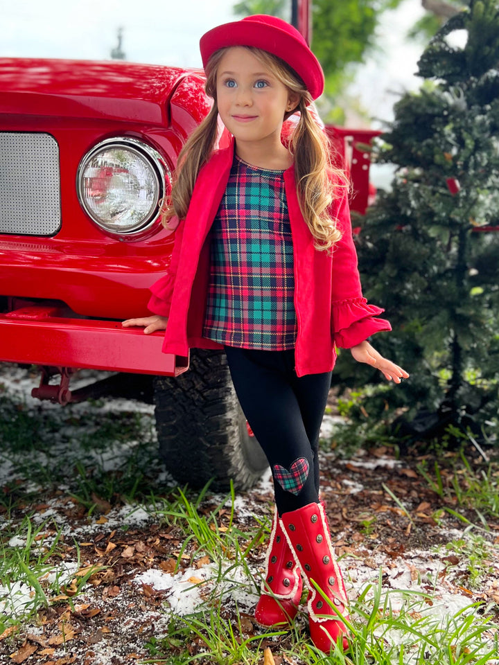 - Set includes long-sleeve plaid top, red cardigan with ruffle details, and black leggings with plaid heart details
