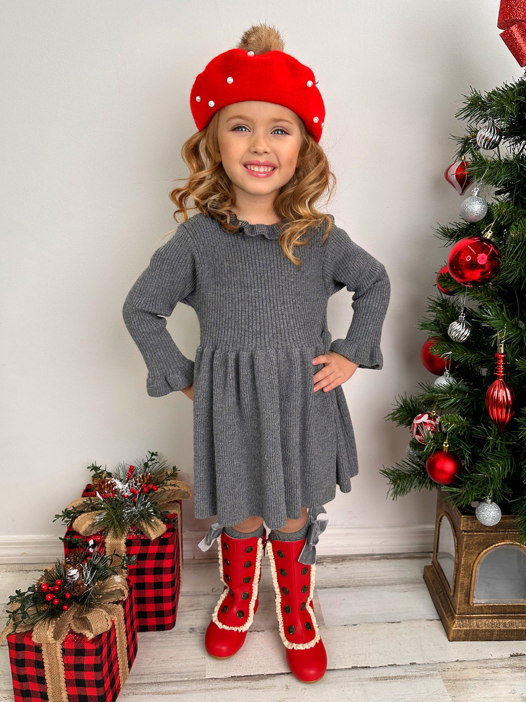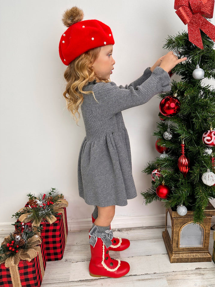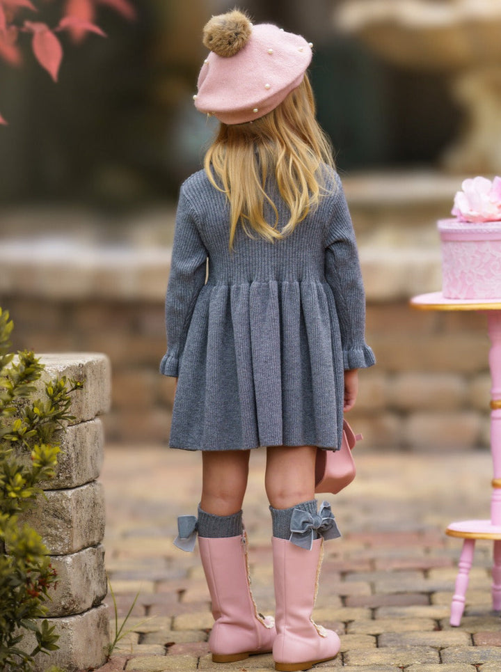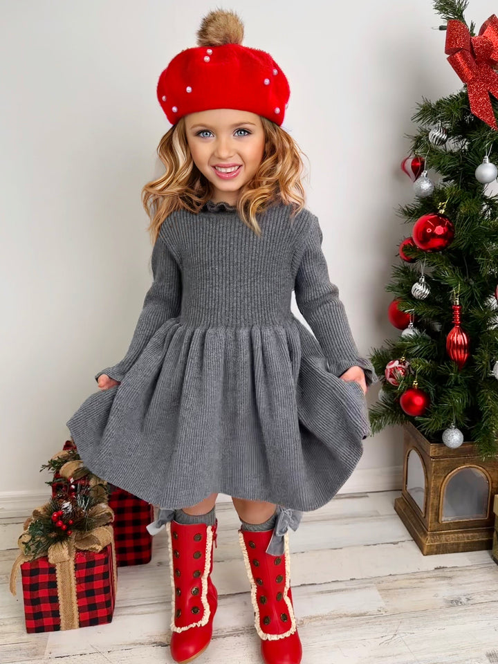 Twinkling lights, warm cocoa, and this grey ruffle knit sweater dress - a magical combination to make your little girl's holiday extra special. This cozy number serves style and comfort with its ruffled collar, pleated skirt, and comfy fit. Guaranteed to be her go-to piece this season!