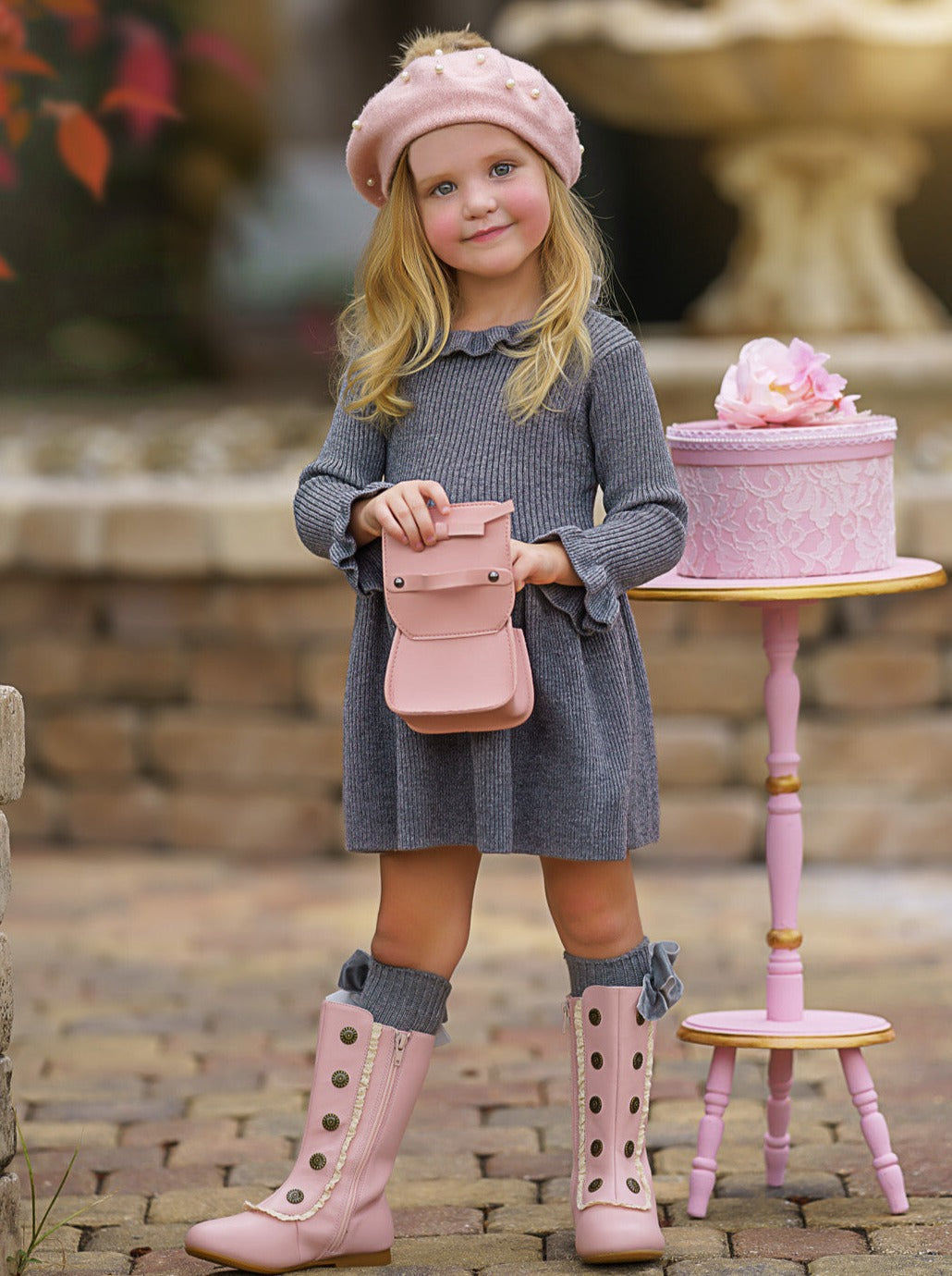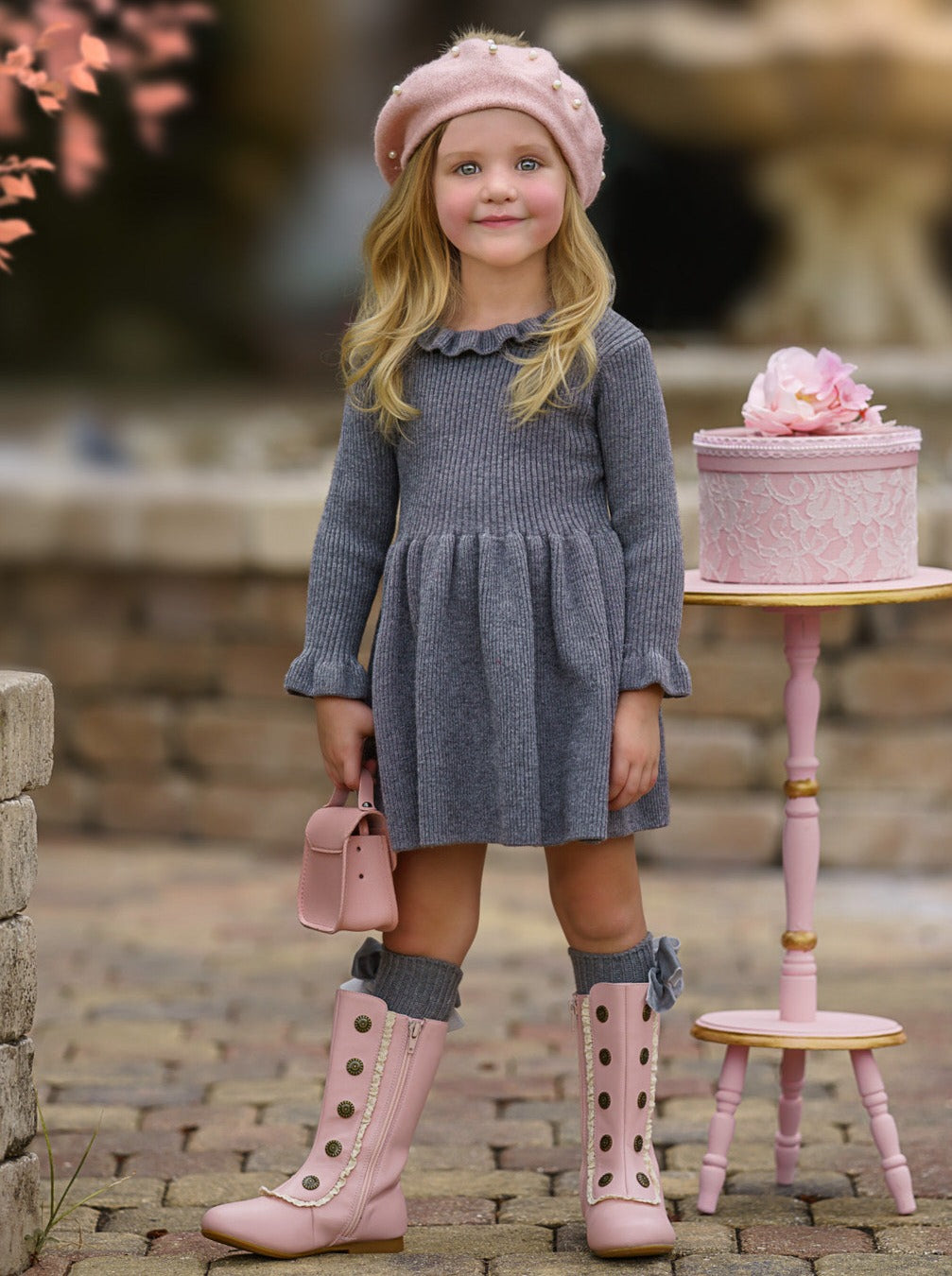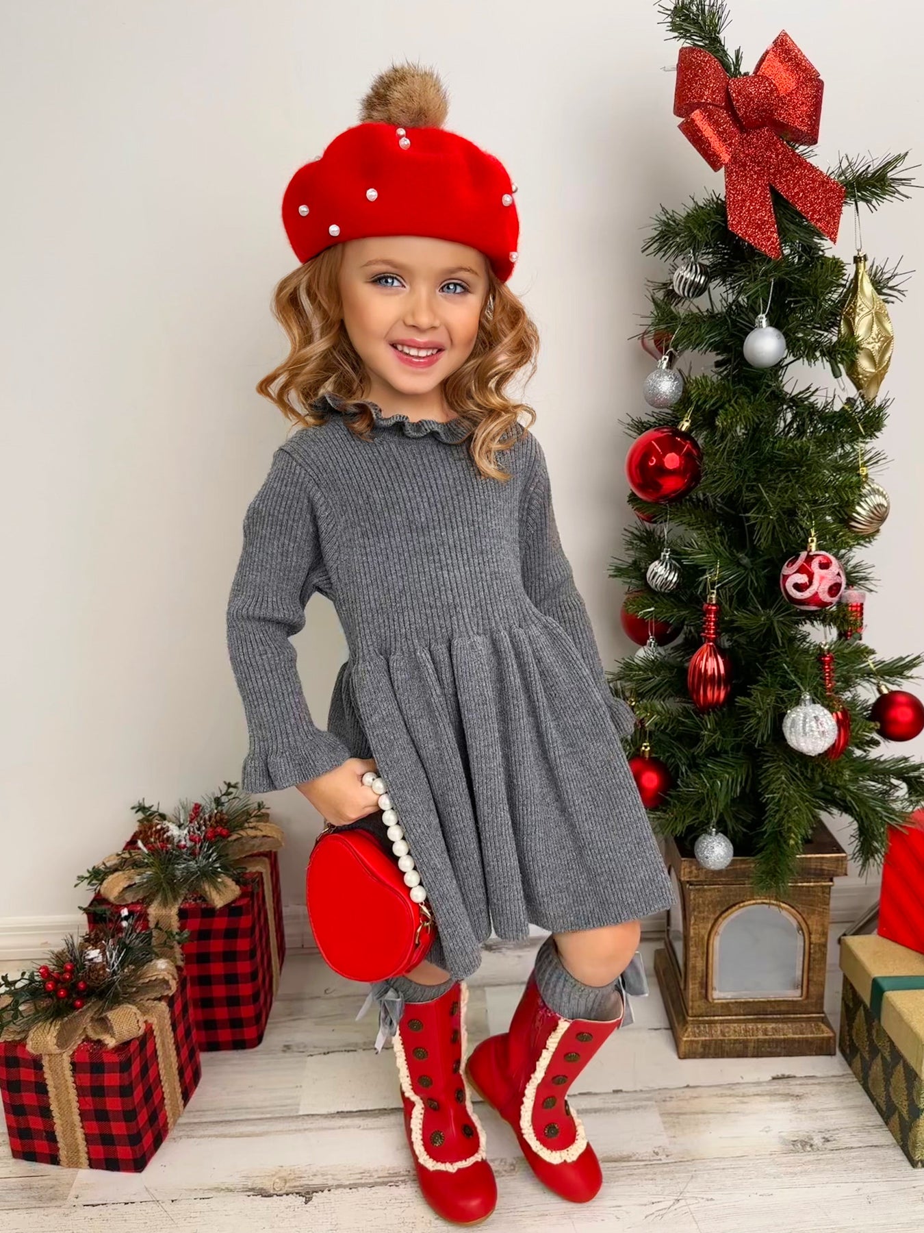 Twinkling lights, warm cocoa, and this grey ruffle knit sweater dress - a magical combination to make your little girl's holiday extra special. This cozy number serves style and comfort with its ruffled collar, pleated skirt, and comfy fit. Guaranteed to be her go-to piece this season!