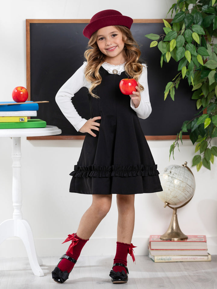 - Perfect for school events, family gatherings, or even casual days out, this dress features a sleek black jumper with delicate ruffle details.