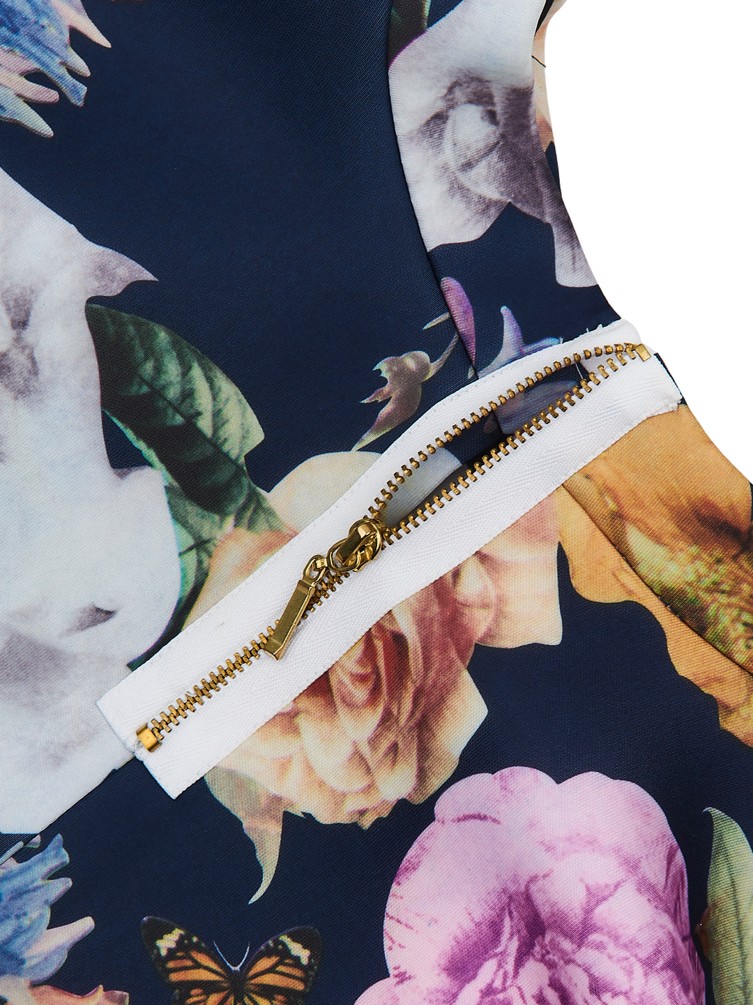 Navy, multi-flower print scuba skirt with zipper closure, hip pleating, and adjustable inner waistband