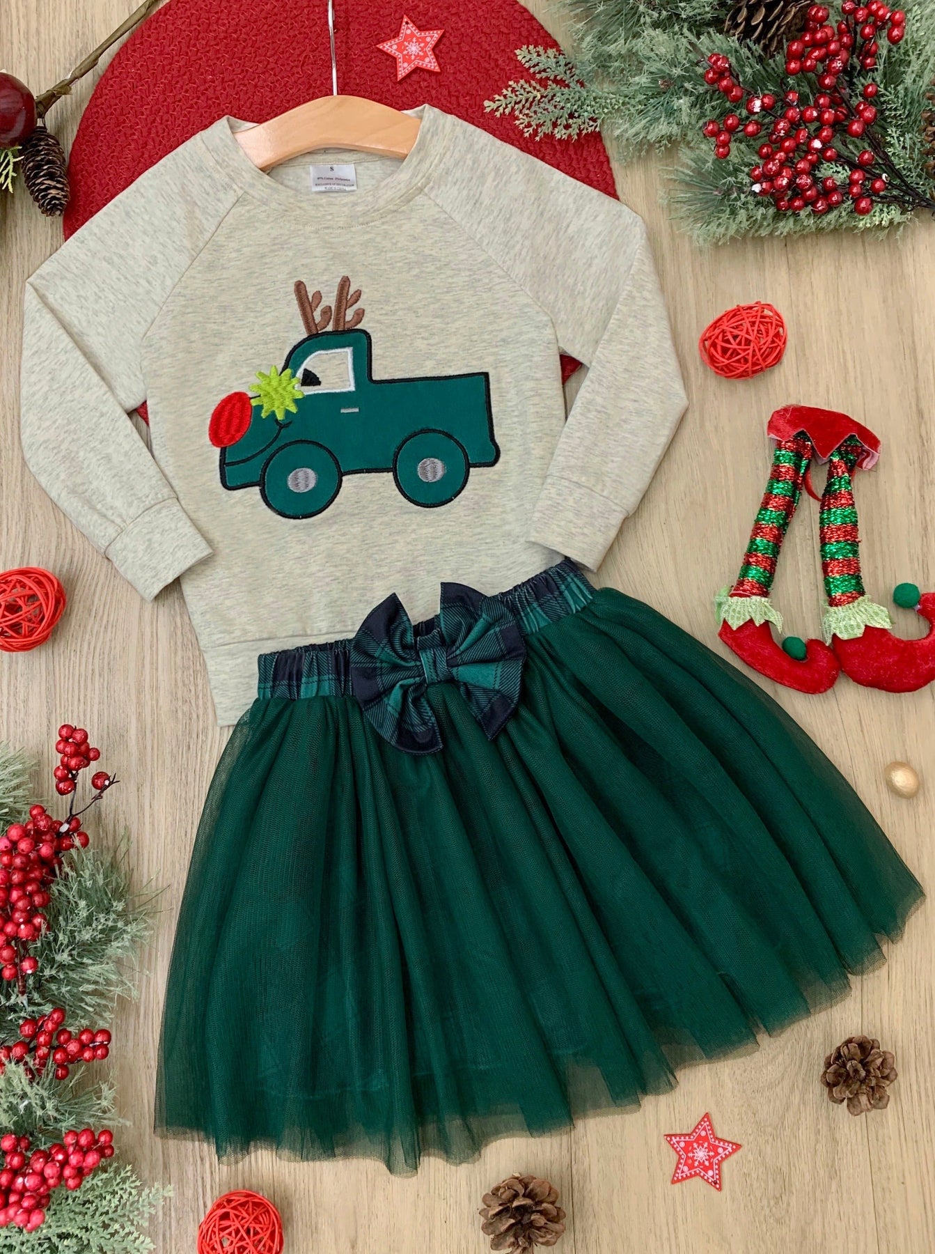 • This sweet reindeer truck plaid tutu skirt set will be your snowflake's favorite outfit of the season. The pullover sweatshirt will keep her cozy, while the plaid and tulle keep her chic.