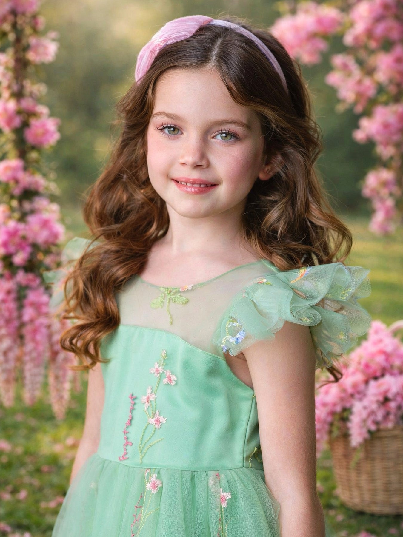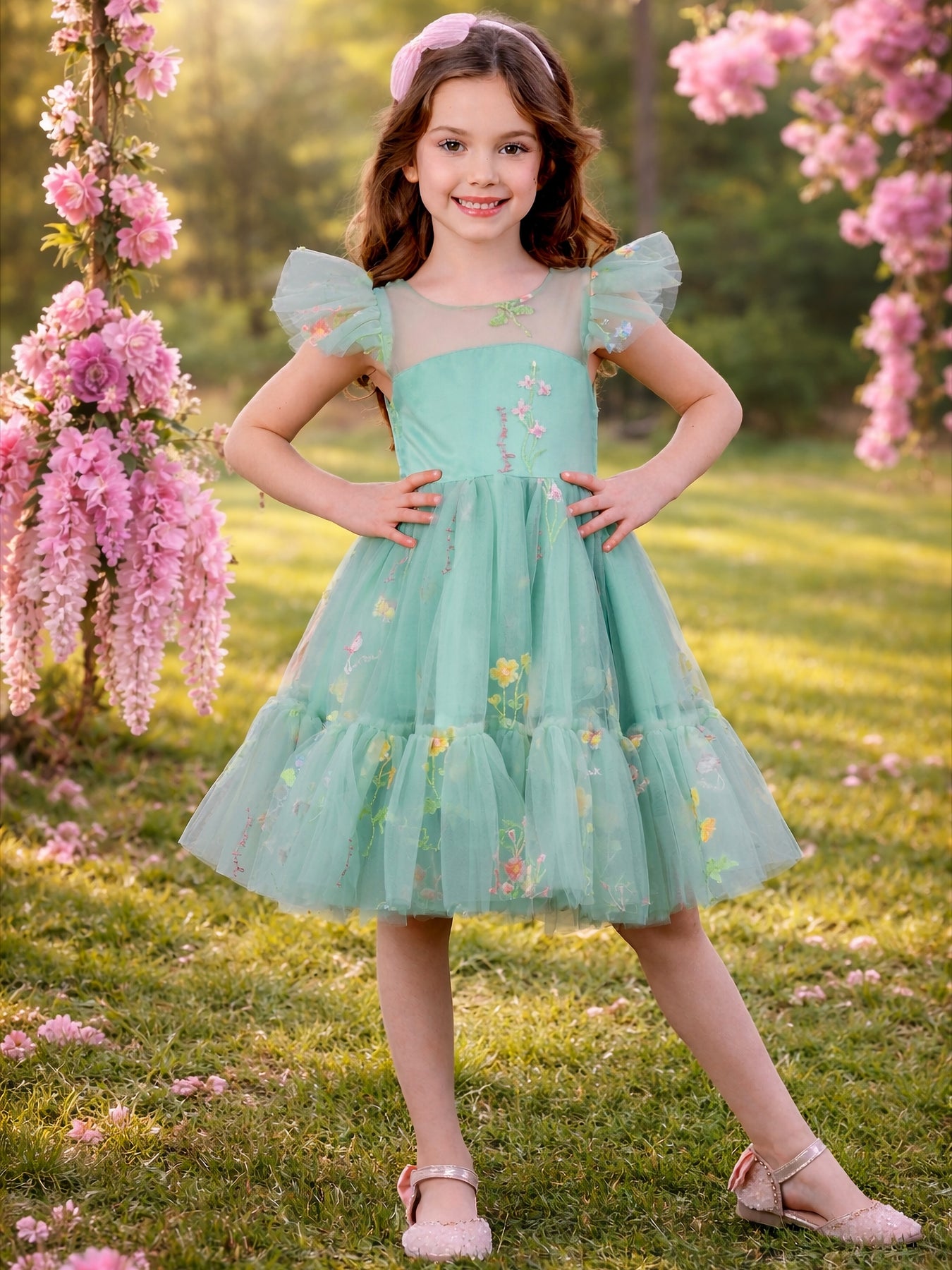 Let her step into a world of enchantment with this stunning emerald green embroidered tulle dress, perfect for magical celebrations, parties, and special occasions.