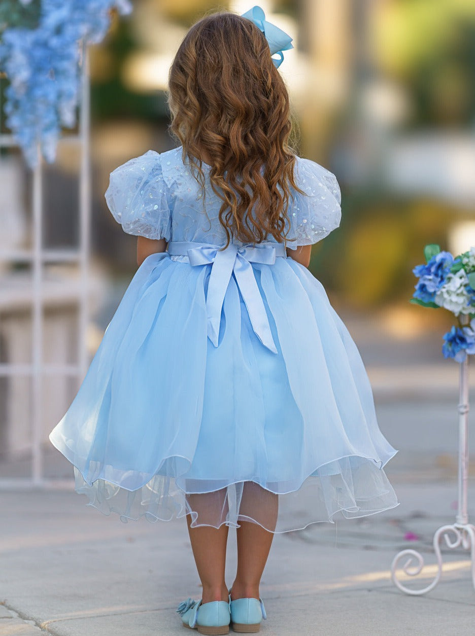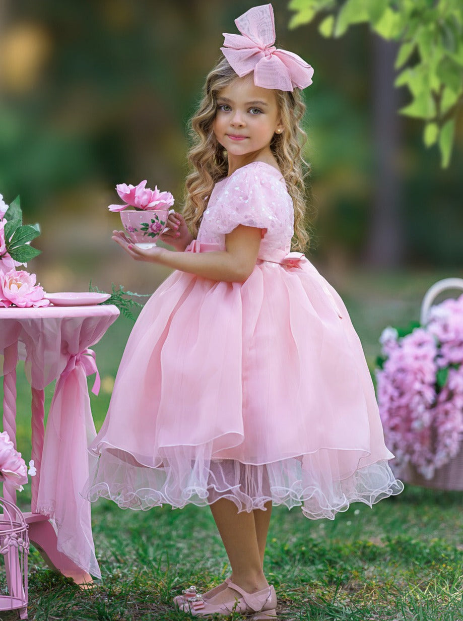 More dresses, more fun! Add this puff sleeve pastel tulle dress to your precious girl's closet collection. With a soft-colored pastel, trendy puff sleeves, and a bow detail, this frilly frock is sure to make her look fashionable and special.