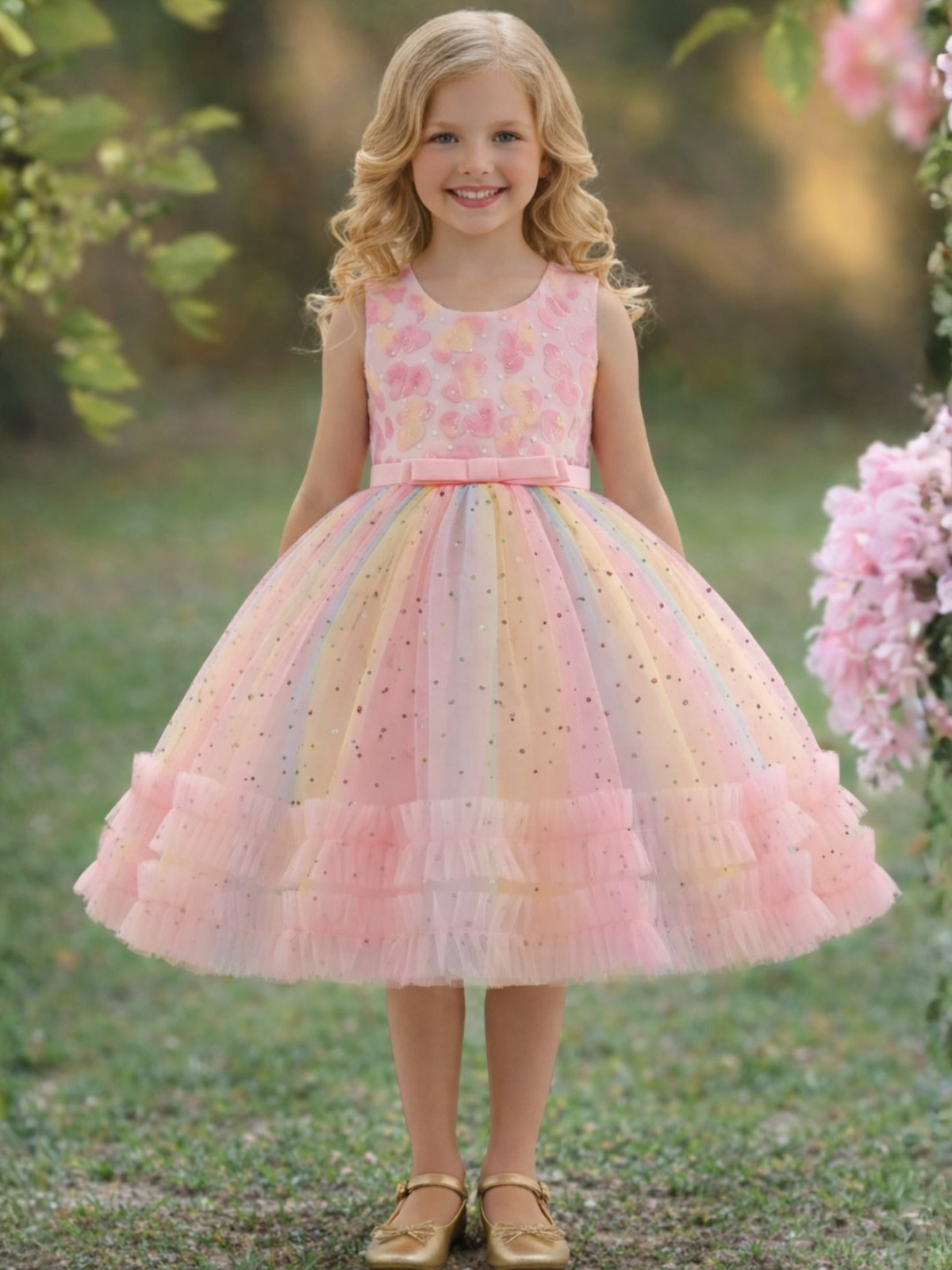 - Sleeveless tulle dress with heart-embellished bodice, pastel rainbow ruffle skirt, and waist bow accent