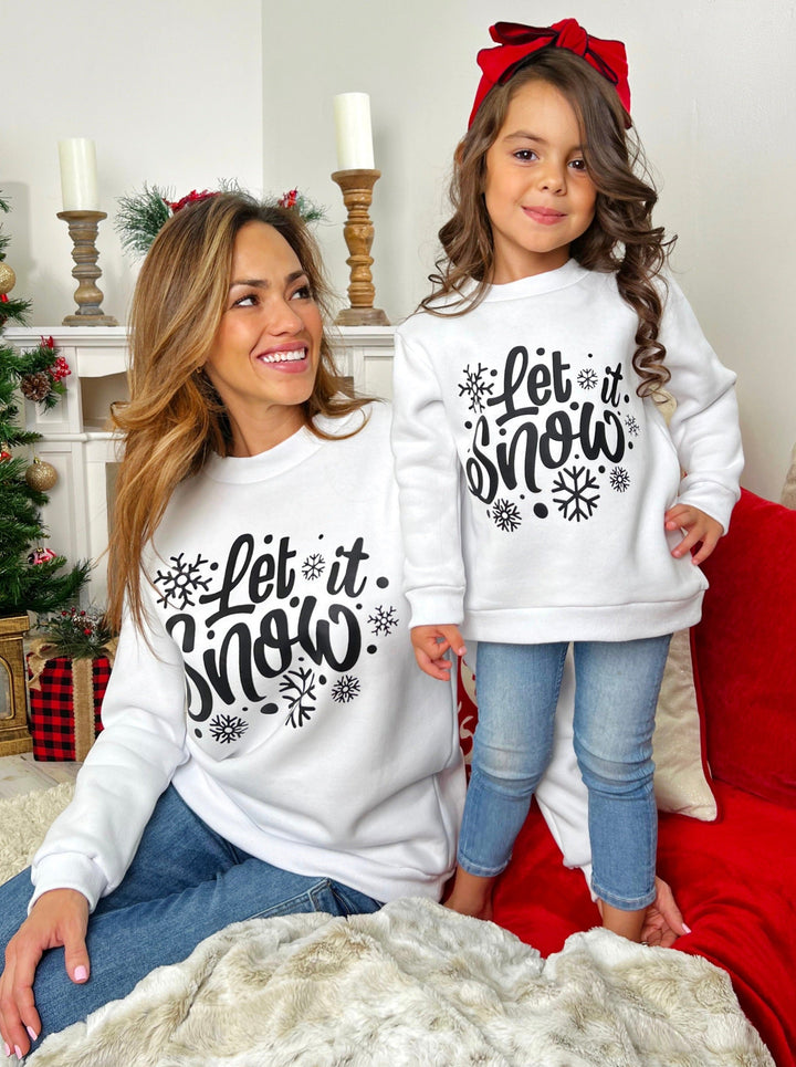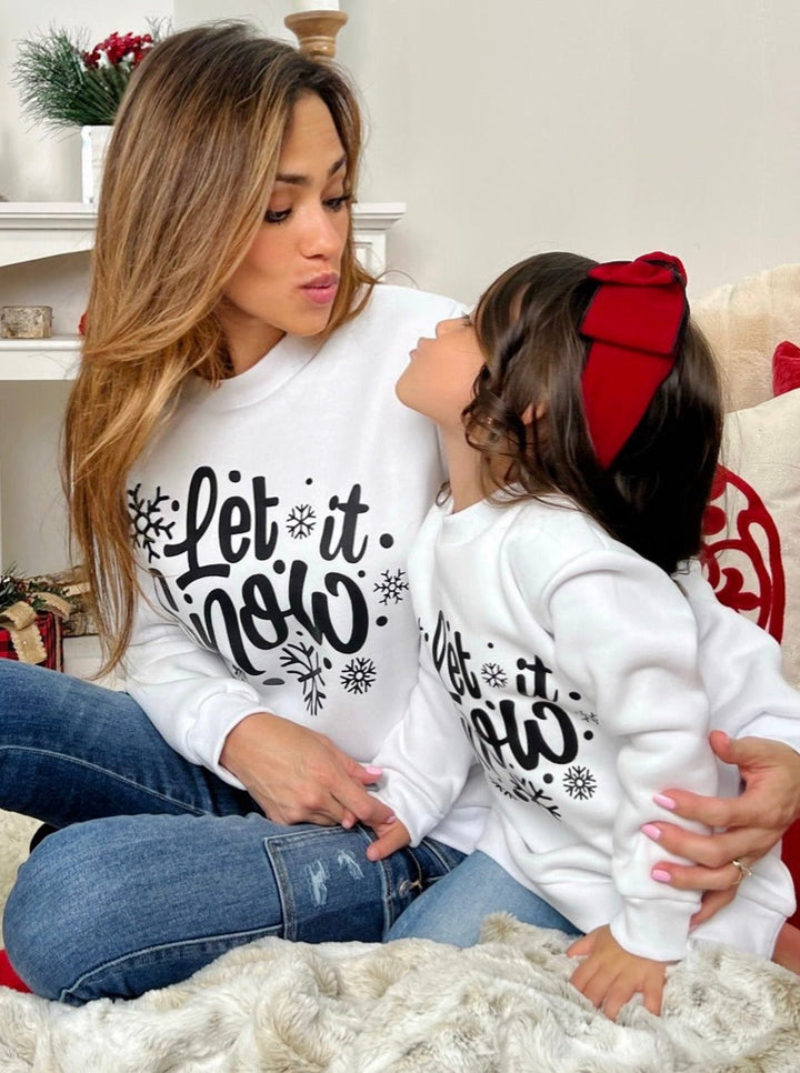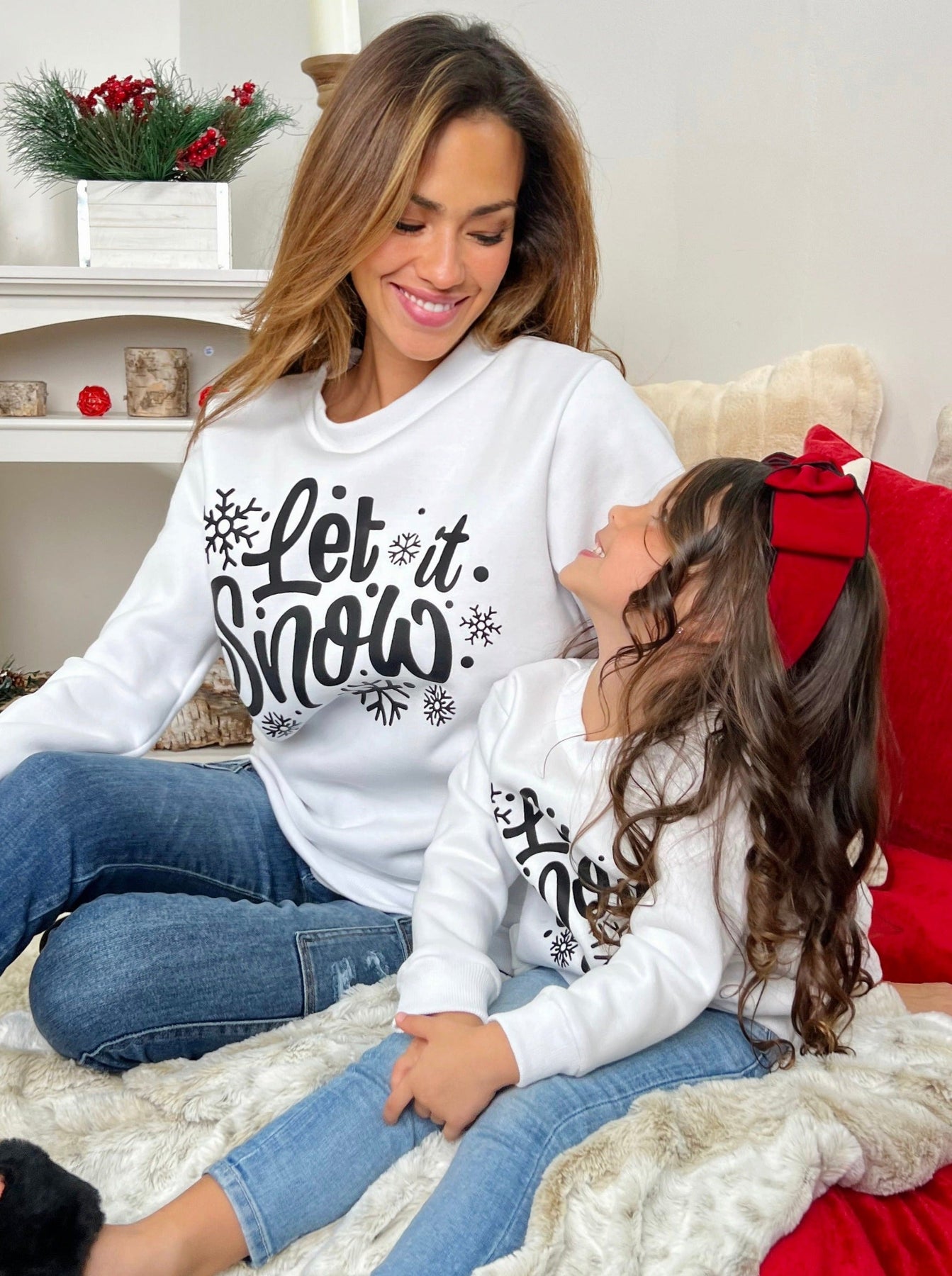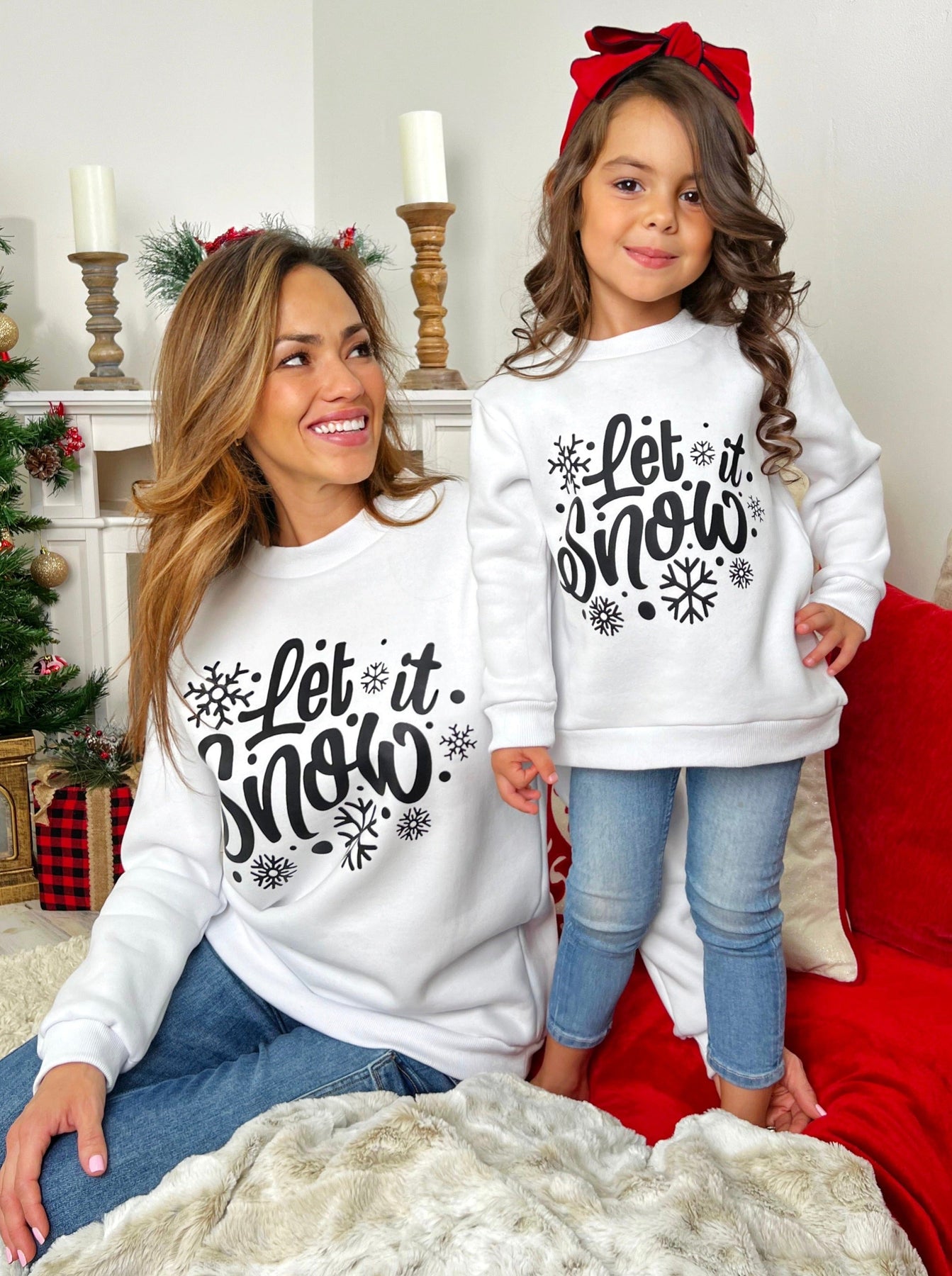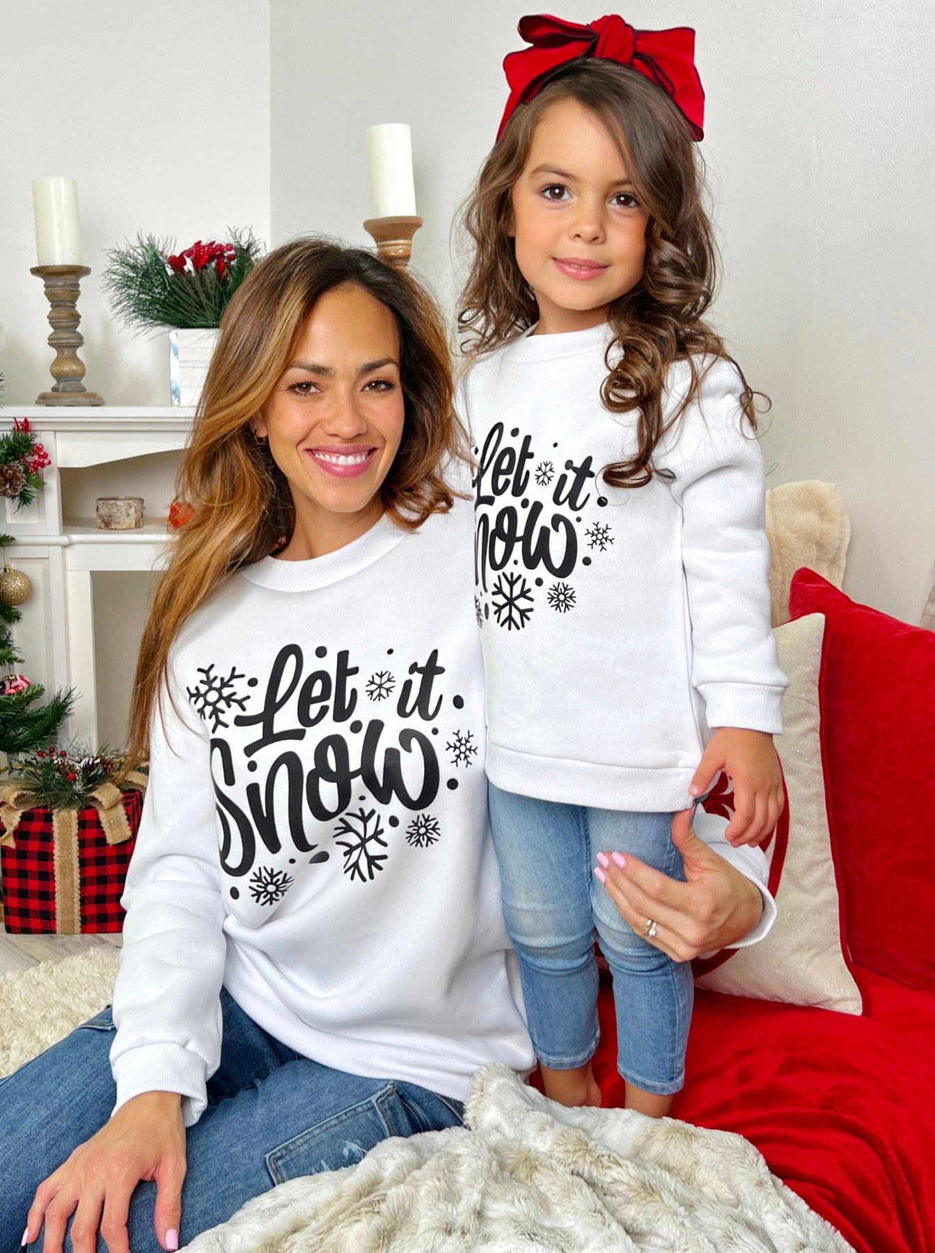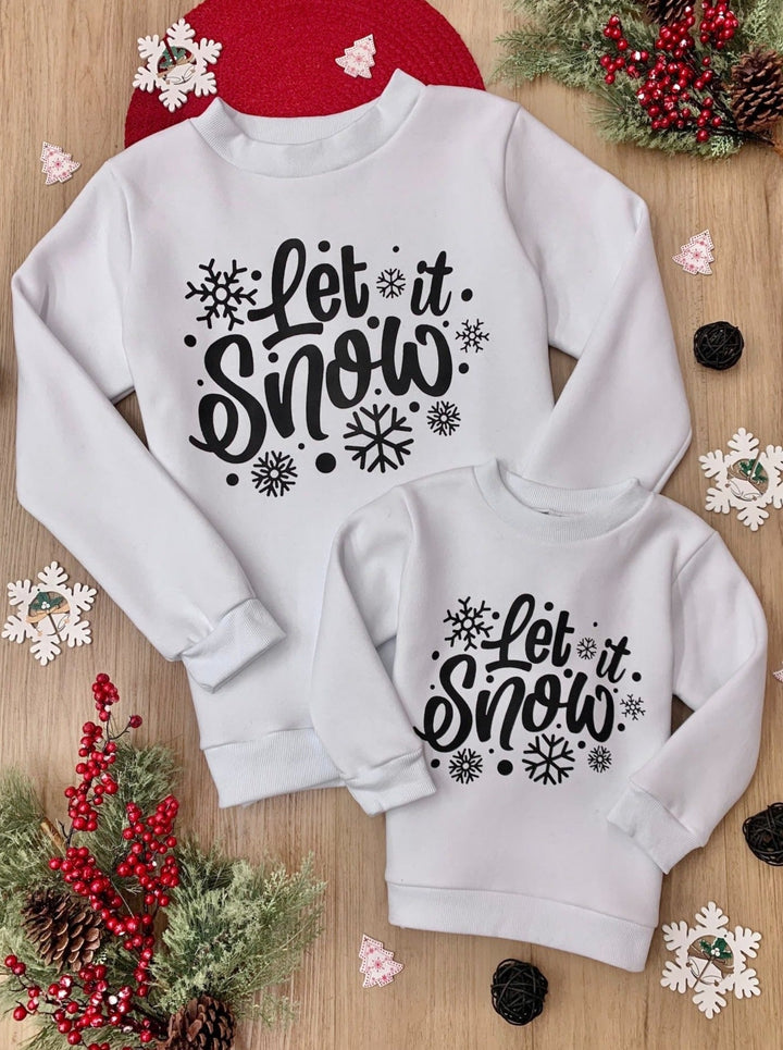 • Make sweater weather extra special with our Mommy and Me Let It Snow pullover sweater. This winter essential is snuggle-worthy and stylish with its classic look and festive print. Enjoy watching the snow fall while cuddling with your baby!
