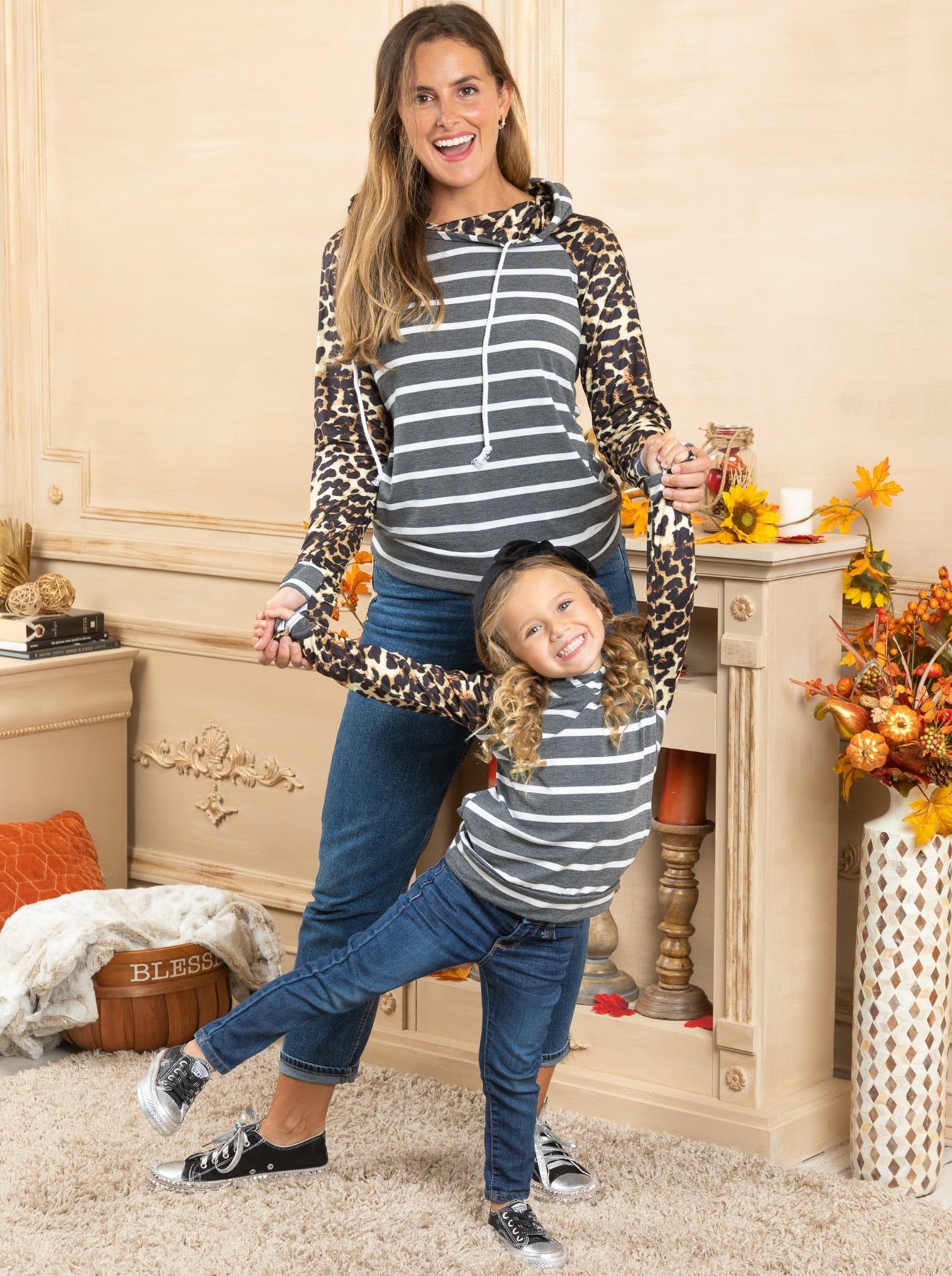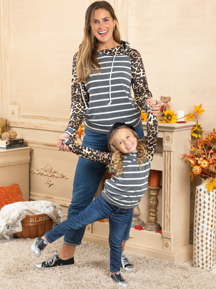- A mother-daughter raglan-sleeve hoodie? Um, YES, please! So trendy with a striped bodice and leopard print sleeves. You and your little girl will love the way you look!