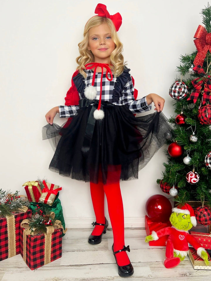 Long-sleeve pullover tutu dress with checkered plaid bodice, satin ruffles down the front, and gathered tulle skirt with satin bow finish