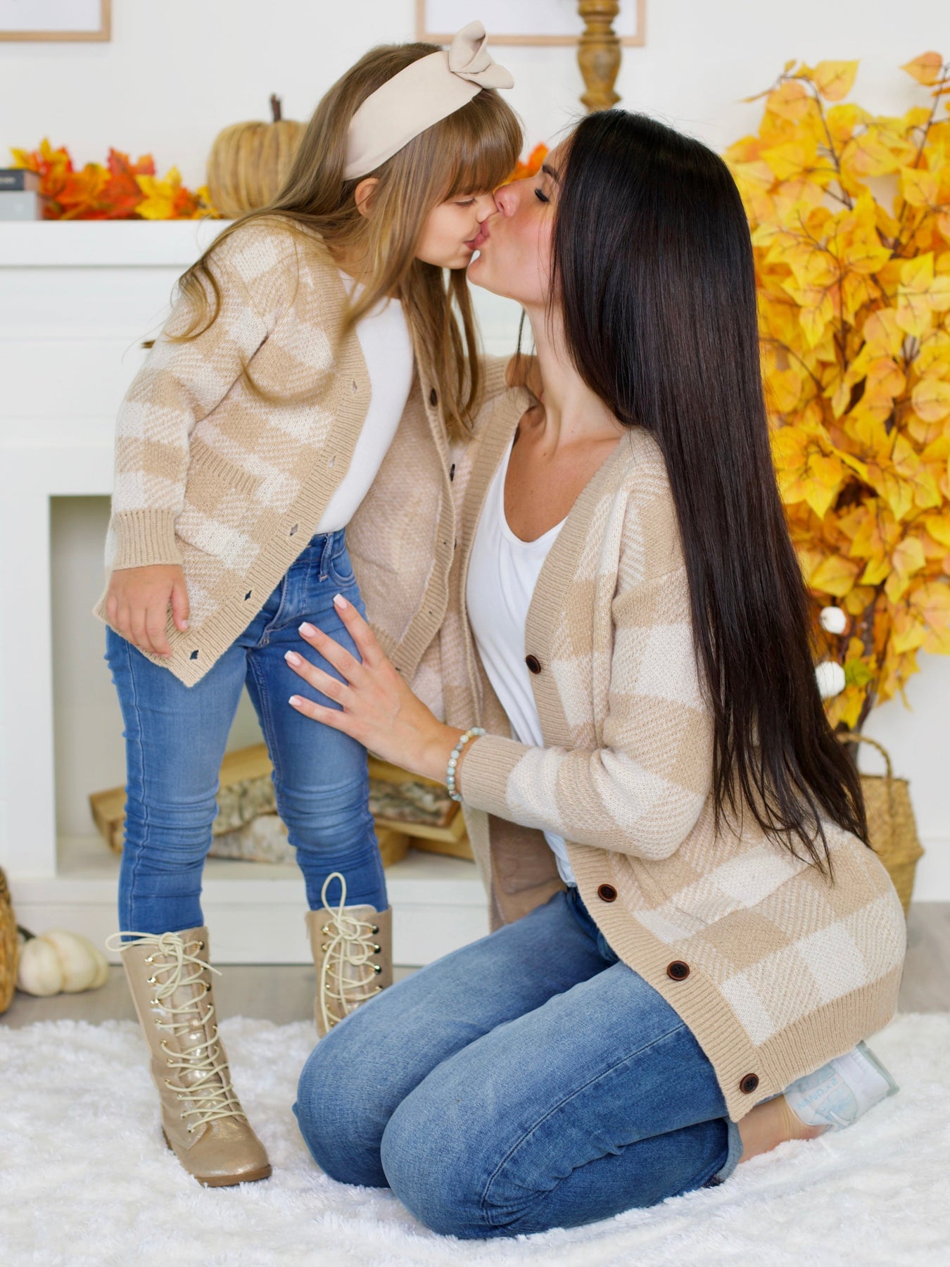 Mommy and Me Beige and White Checkered Oversized Cardigan