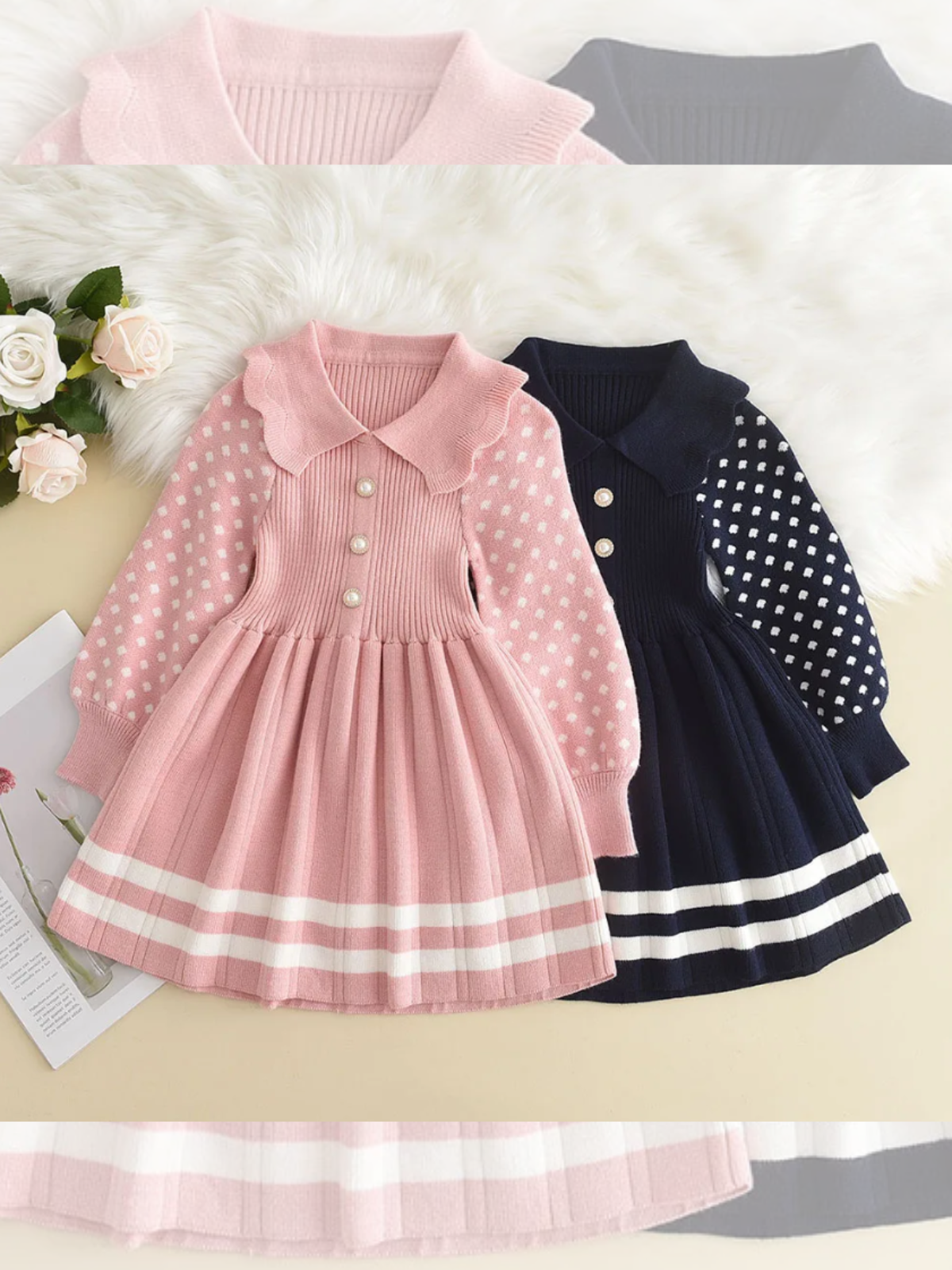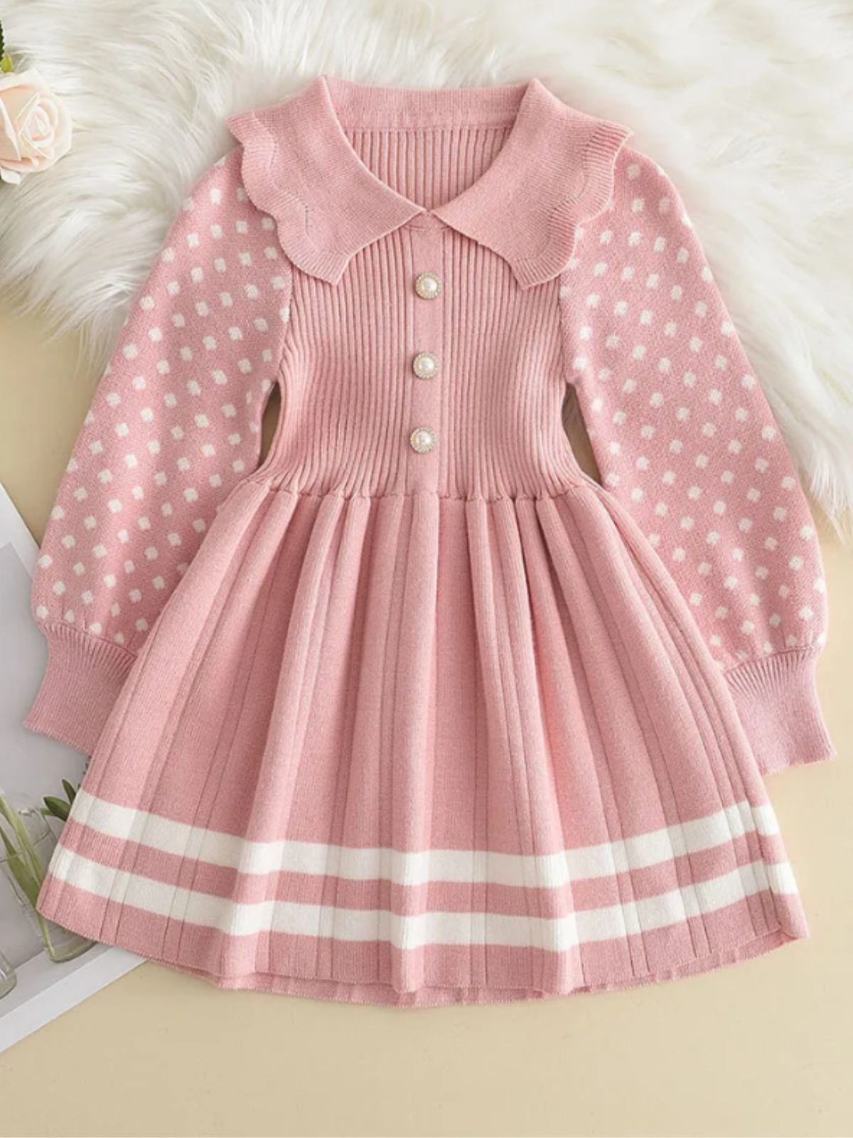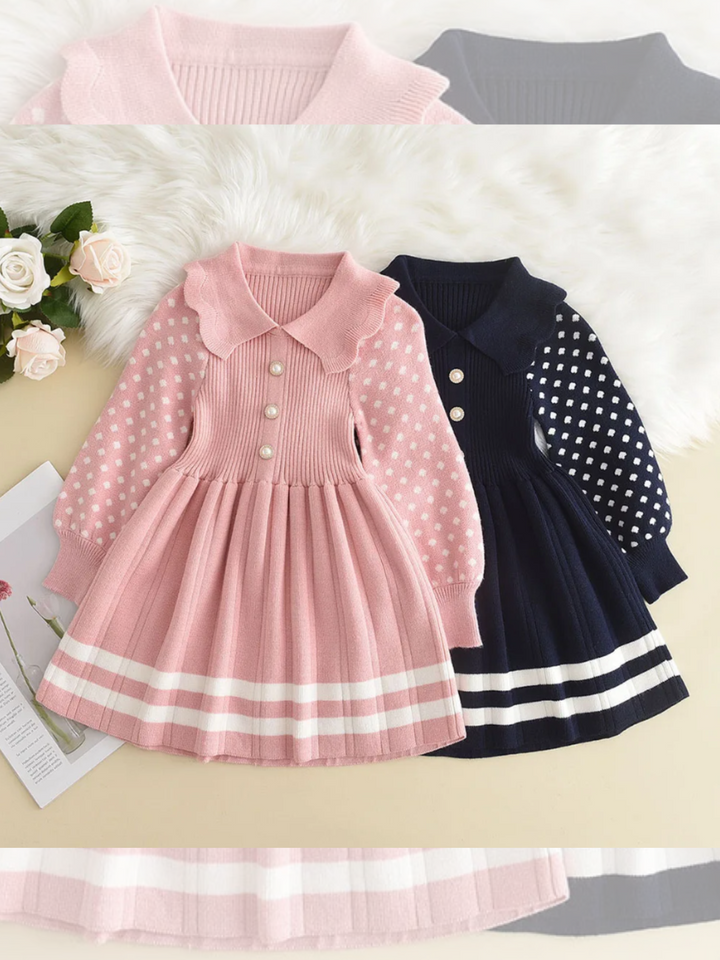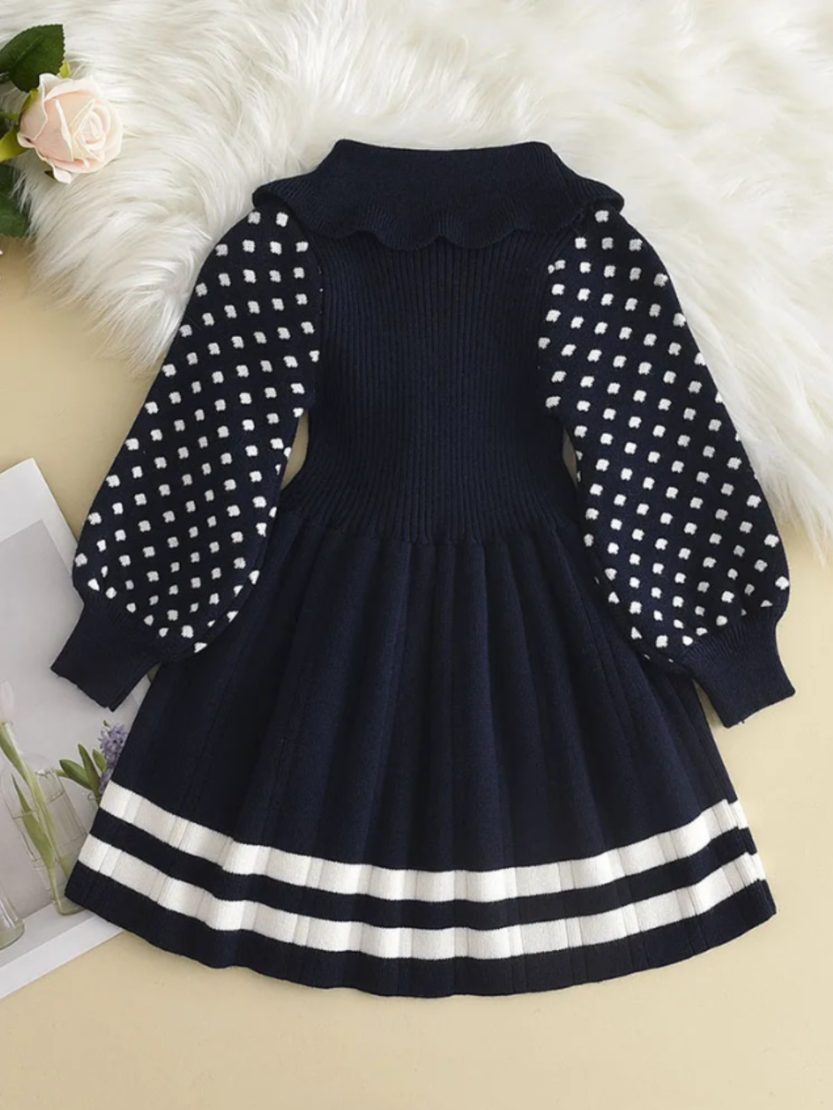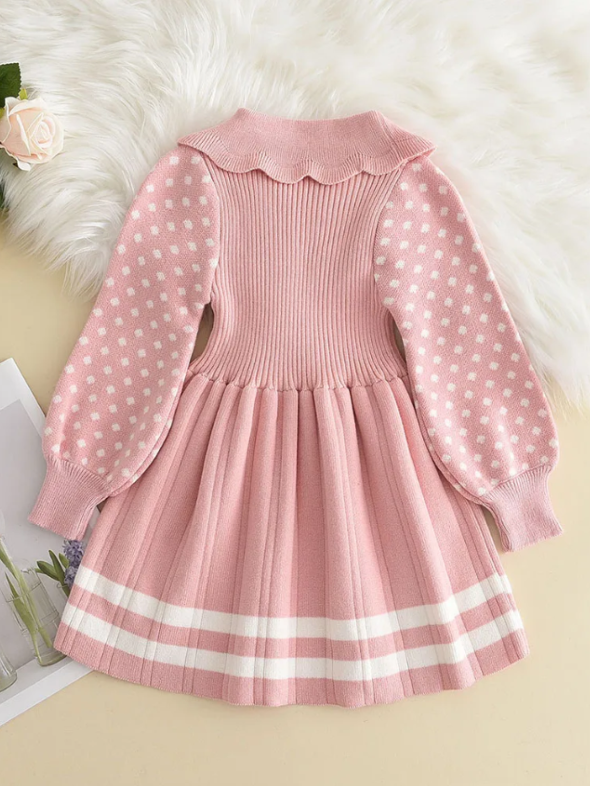 - Add a touch of charm to your little one's wardrobe with our adorable knit dress, featuring a sweet scalloped collar and playful polka-dot sleeves!