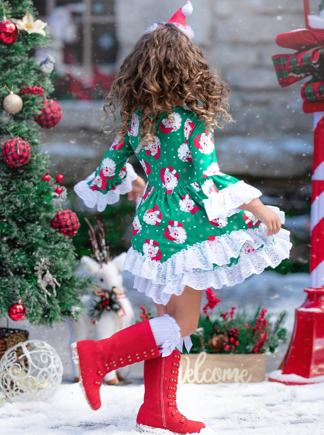 • Long-sleeve pullover Santa print ruffle dress with flounce crochet lace cuffs, tiered skirt, and crochet lace hem