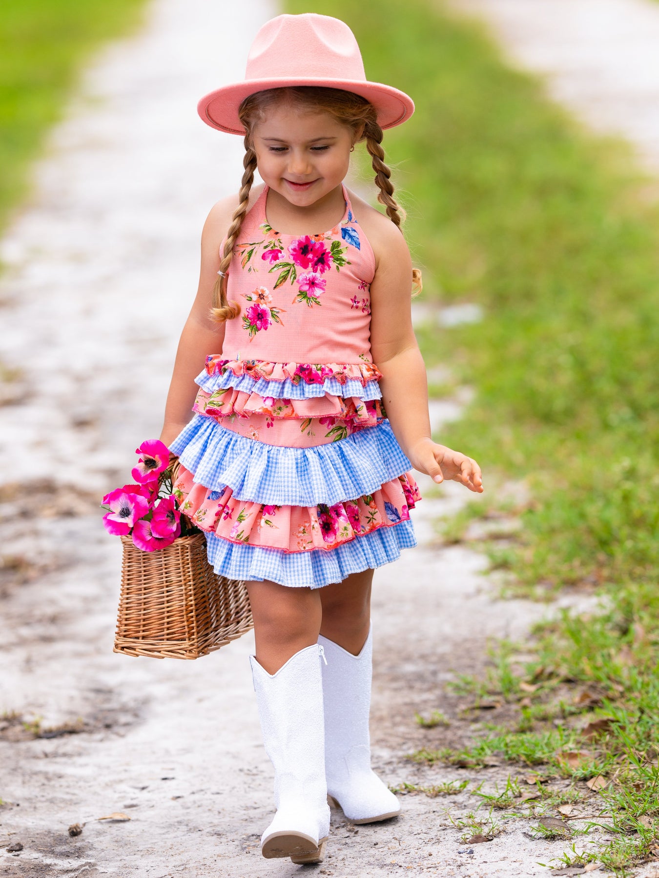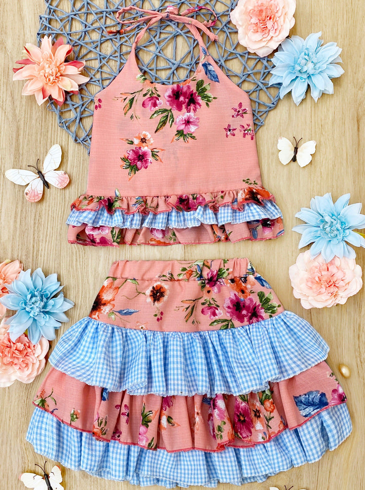 Make a sassy spring statement with our floral/plaid halter skirt set! The gentle fabric billows and flows effortlessly for the cutest casual tiered skirt and halter top combo you have ever seen!