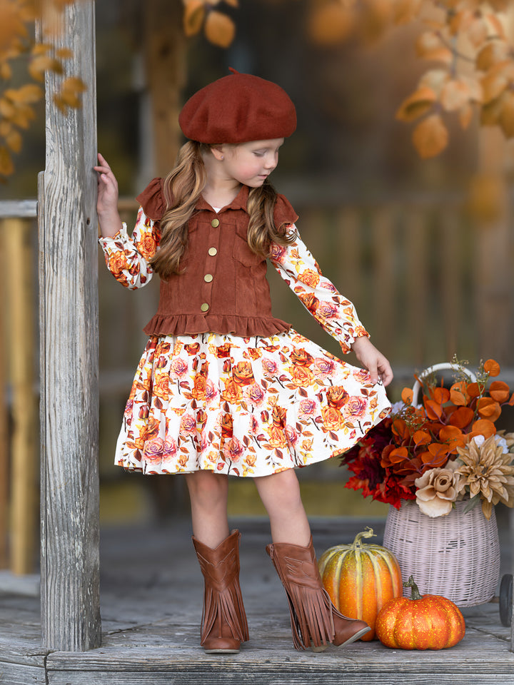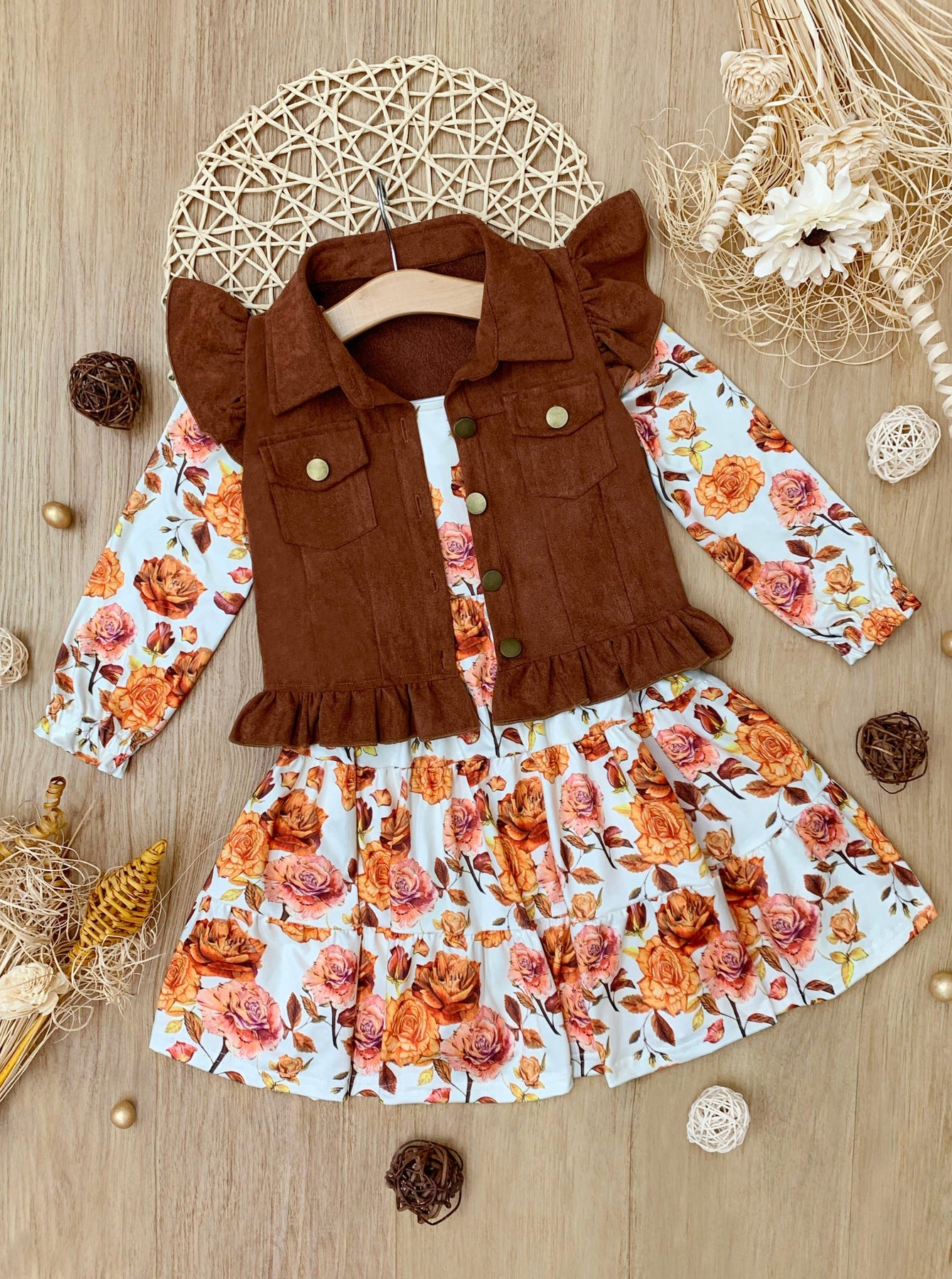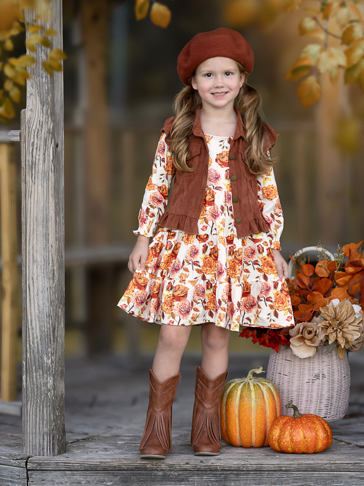 • Embrace the beauty of autumn with this charming Girls' Floral Dress and Faux Suede Vest Set
