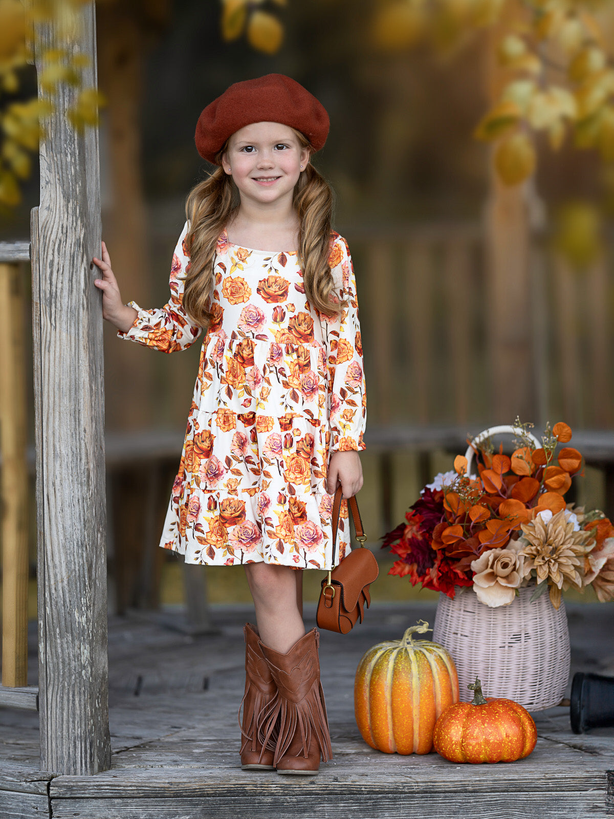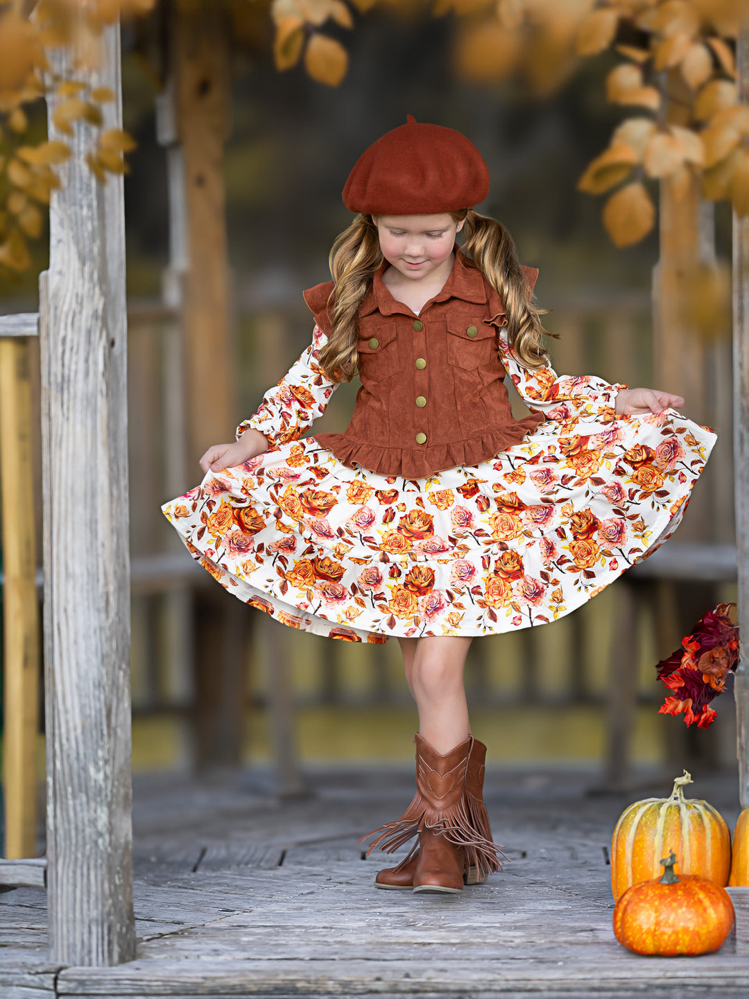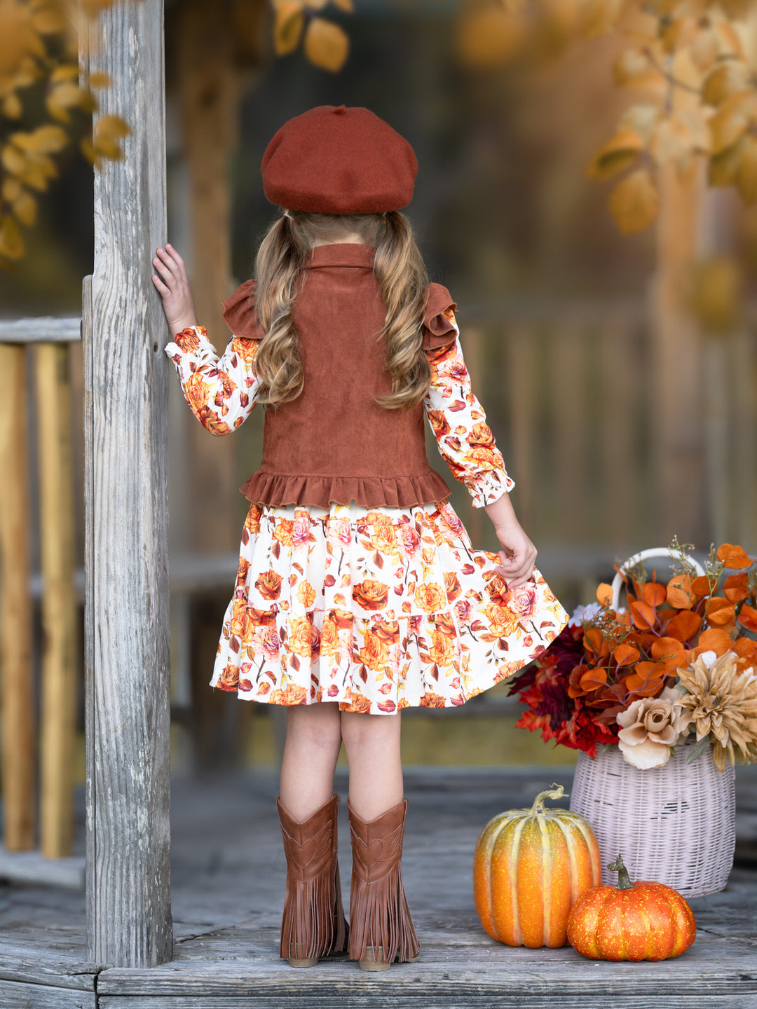 • Embrace the beauty of autumn with this charming Girls' Floral Dress and Faux Suede Vest Set