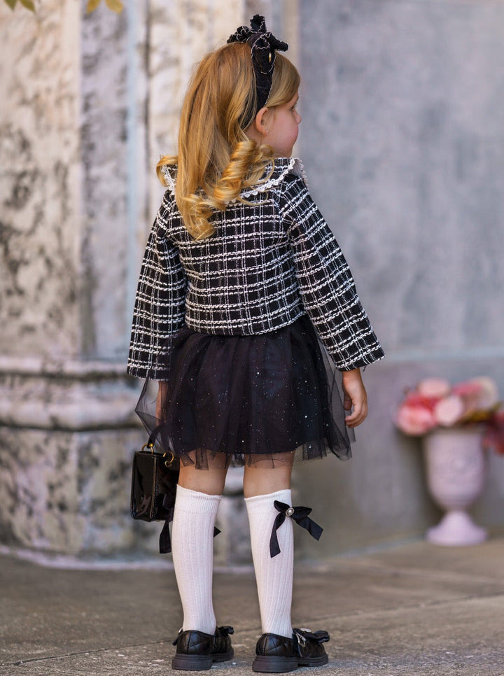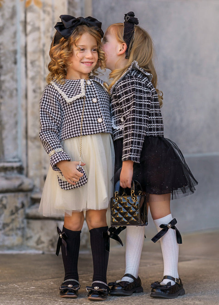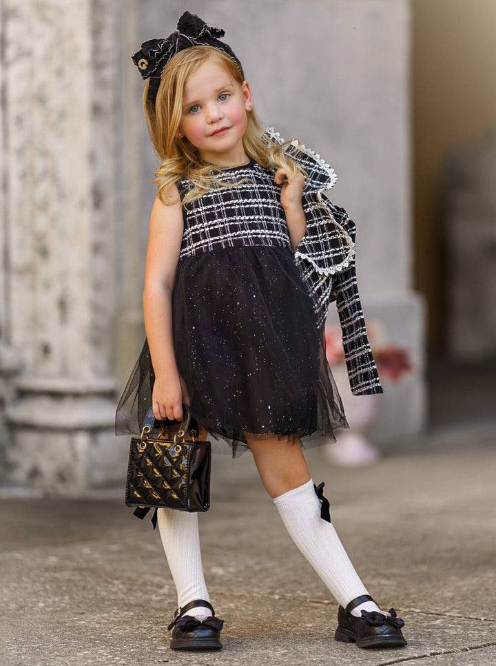 Your little girl will be looking like a little VIP in this black tweed tutu dress and blazer set. Designed with scallop lace trimming and button details, this lovely pairing will make her look extra classy and elegant. Pair with dark sunglasses for a paparazzi-safe finish!