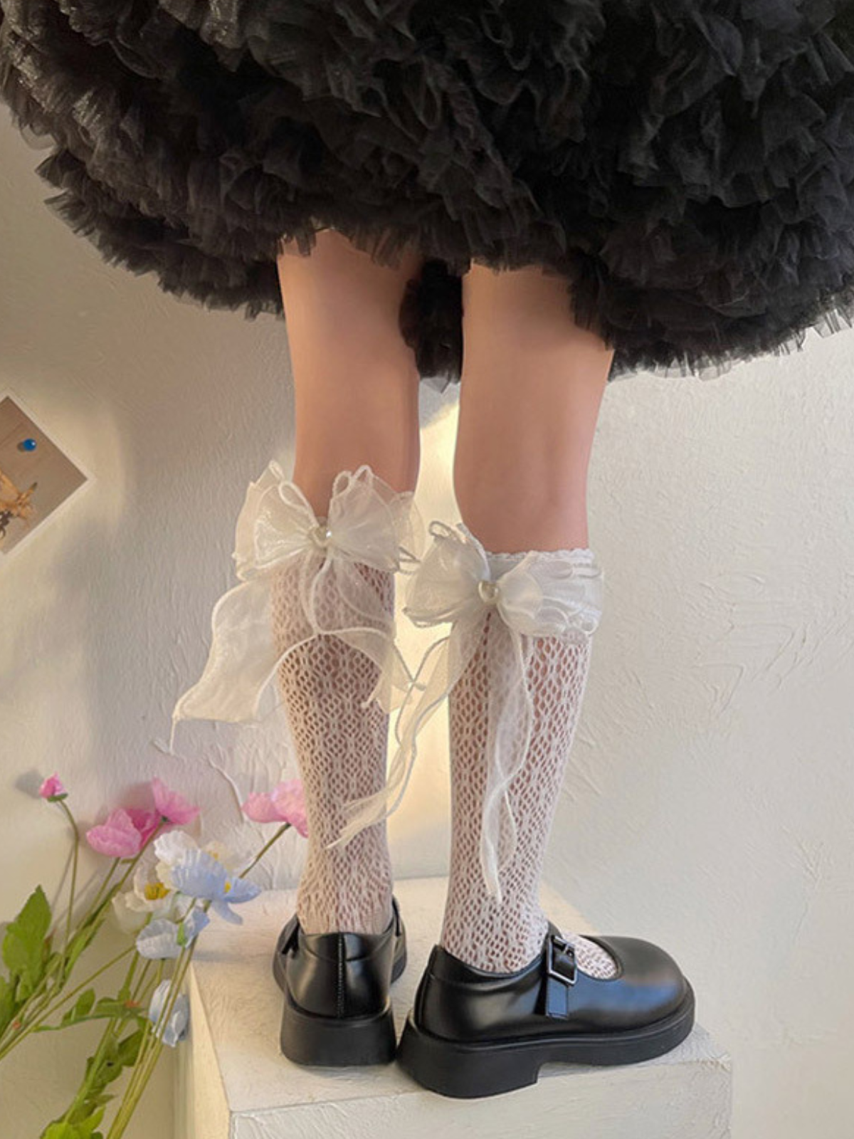 White knee-high mesh socks with tulle bow accents