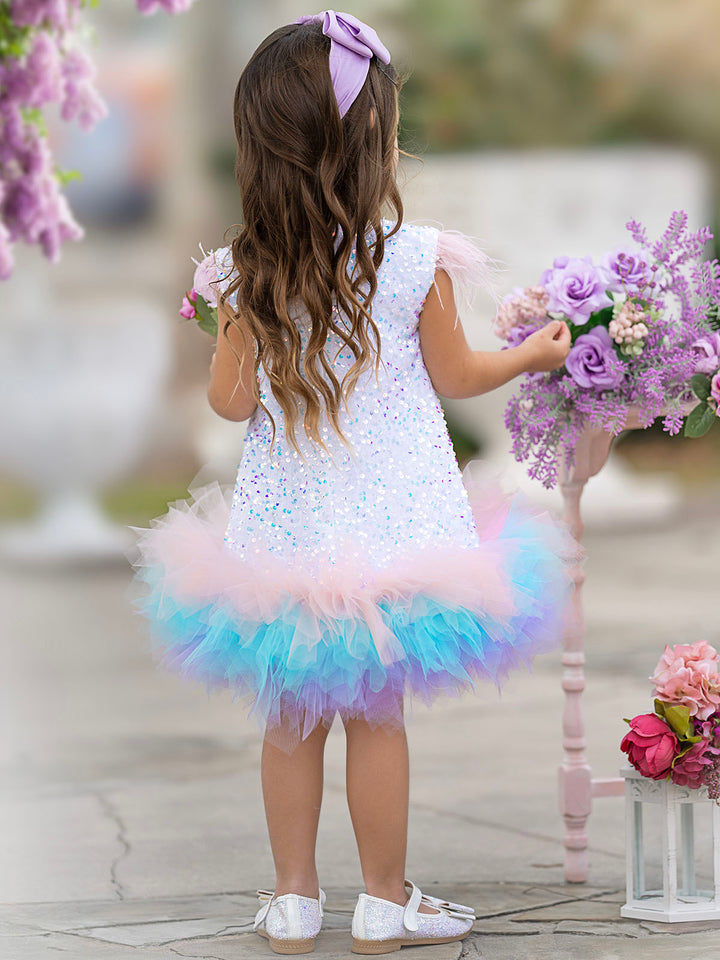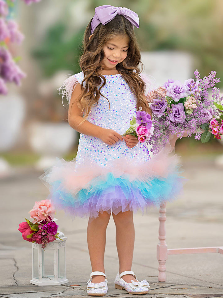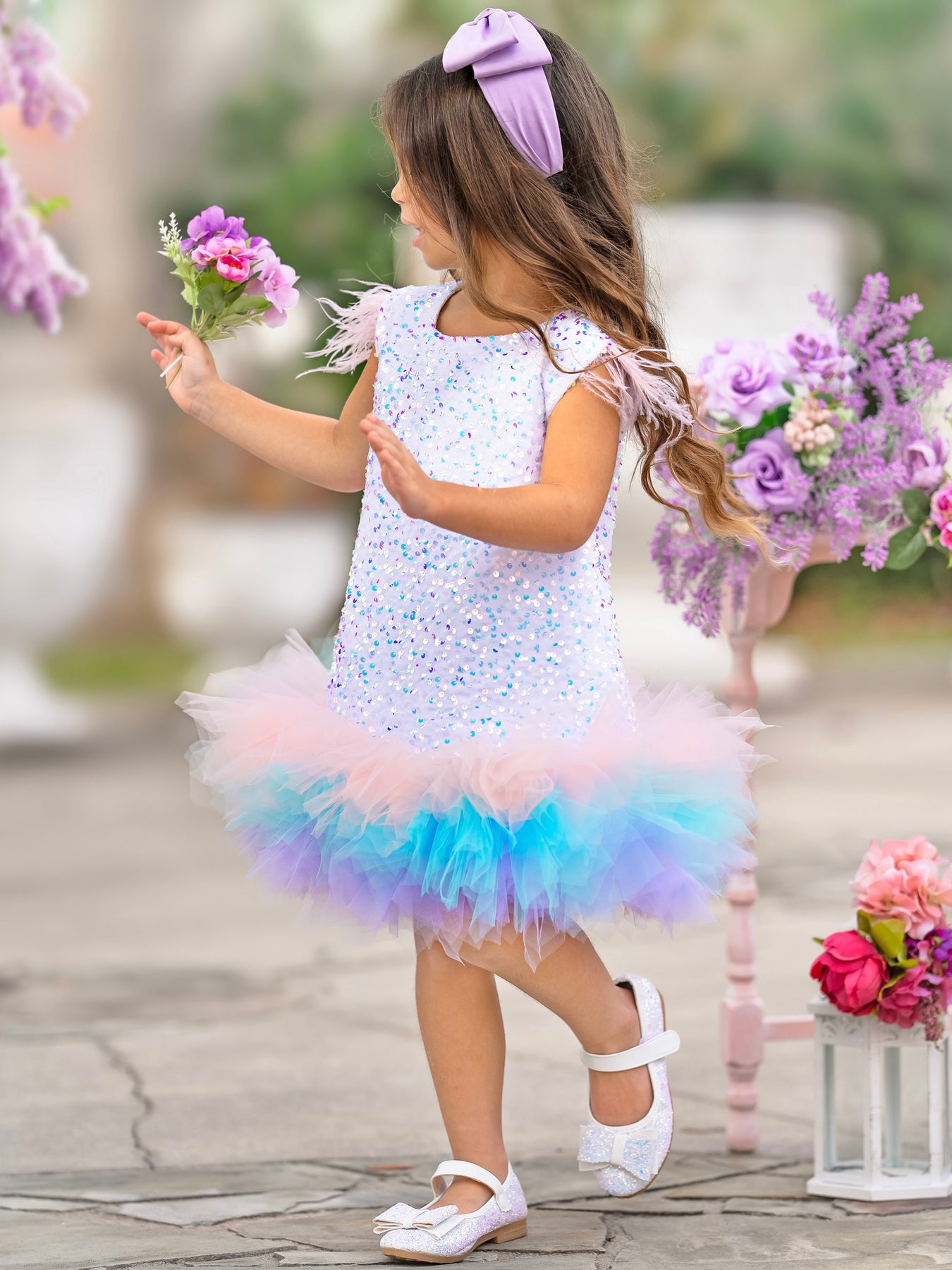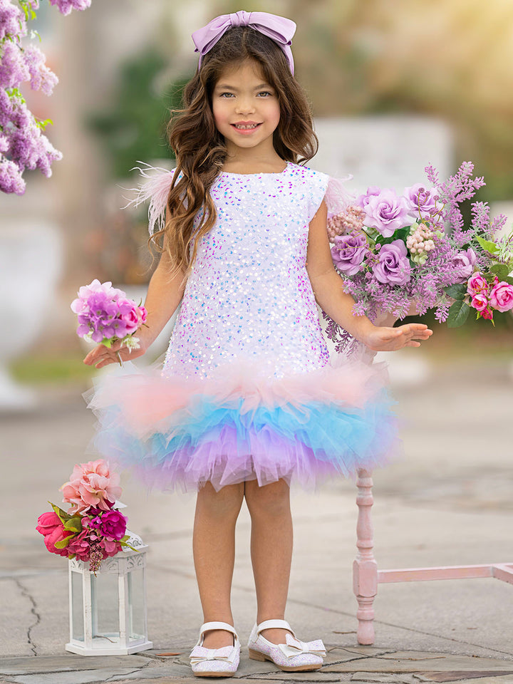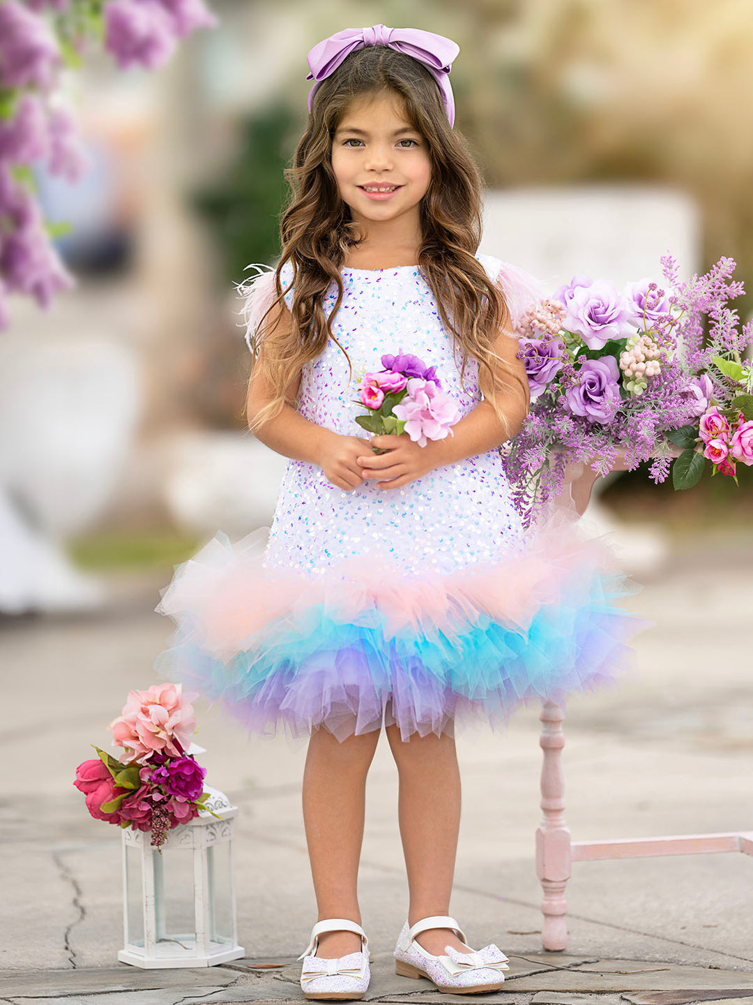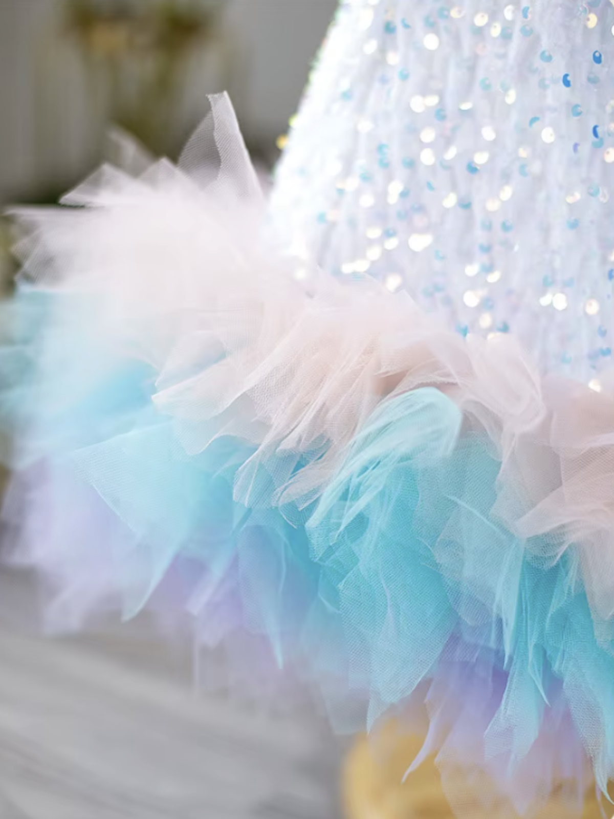 The vibrant, rainbow-colored tulle hem creates a magical effect, ensuring your little one stands out at any event.