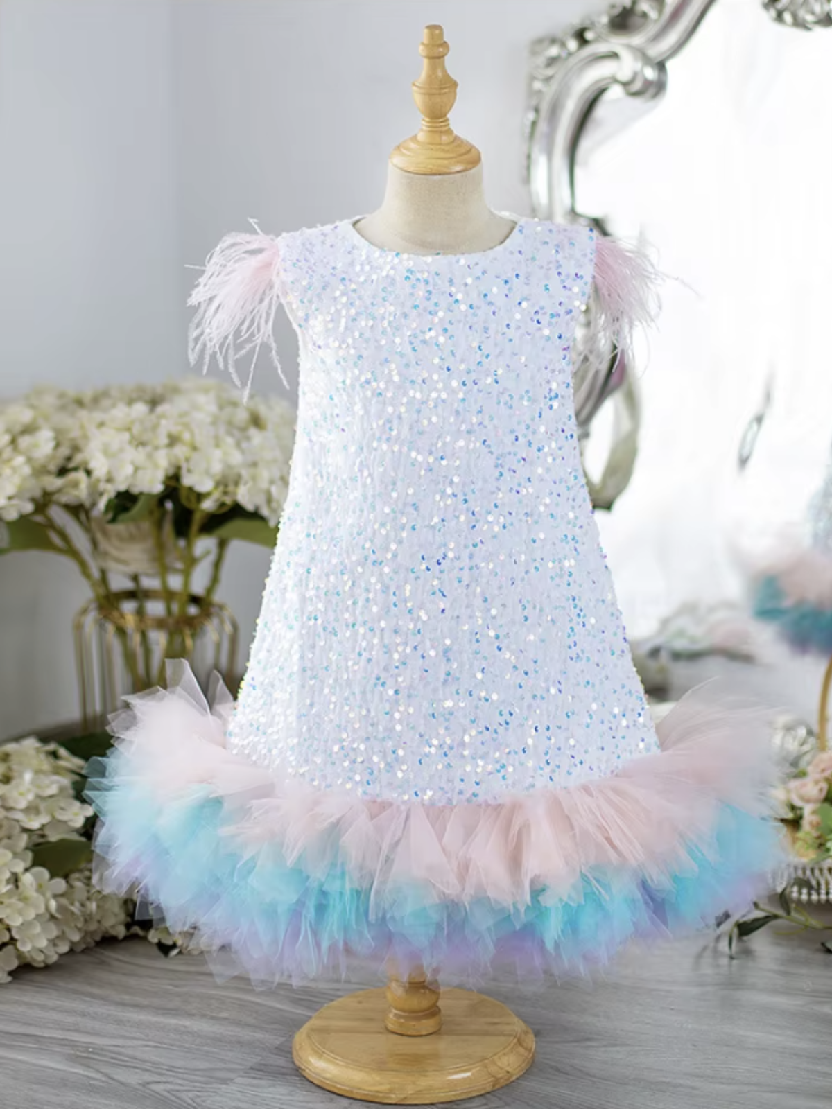 This sleeveless dress features shimmering sequins that sparkle beautifully under any light, perfect for parties and special occasions. Delicate feather accents on the shoulders add a touch of sophistication and charm to this one-of-a-kind piece.