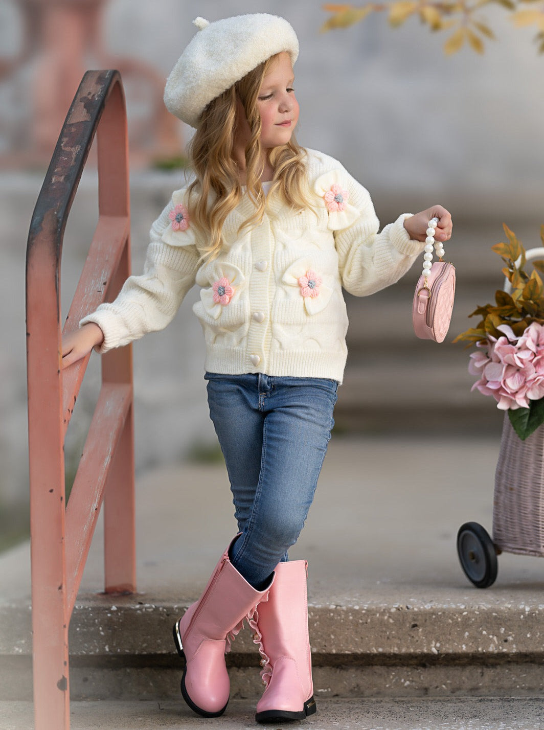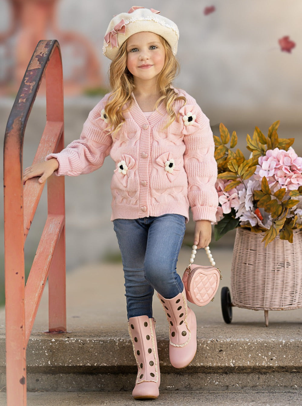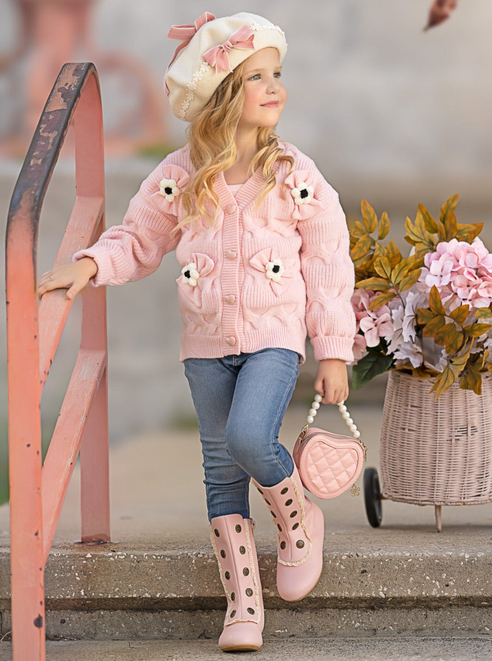- This Girls Floral Button-Up Cardigan features charming knitted flowers, adding a cute and playful touch to any outfit.