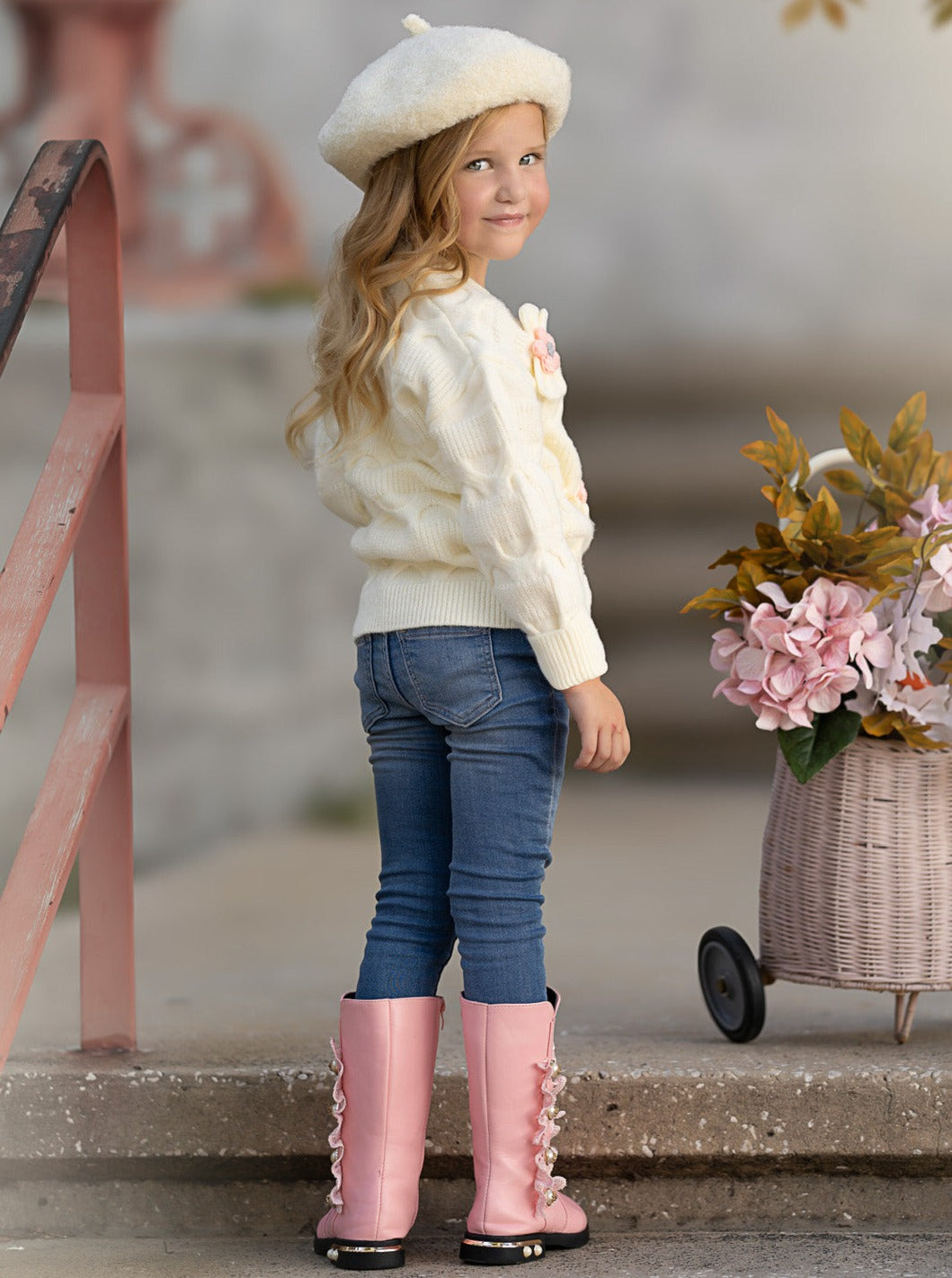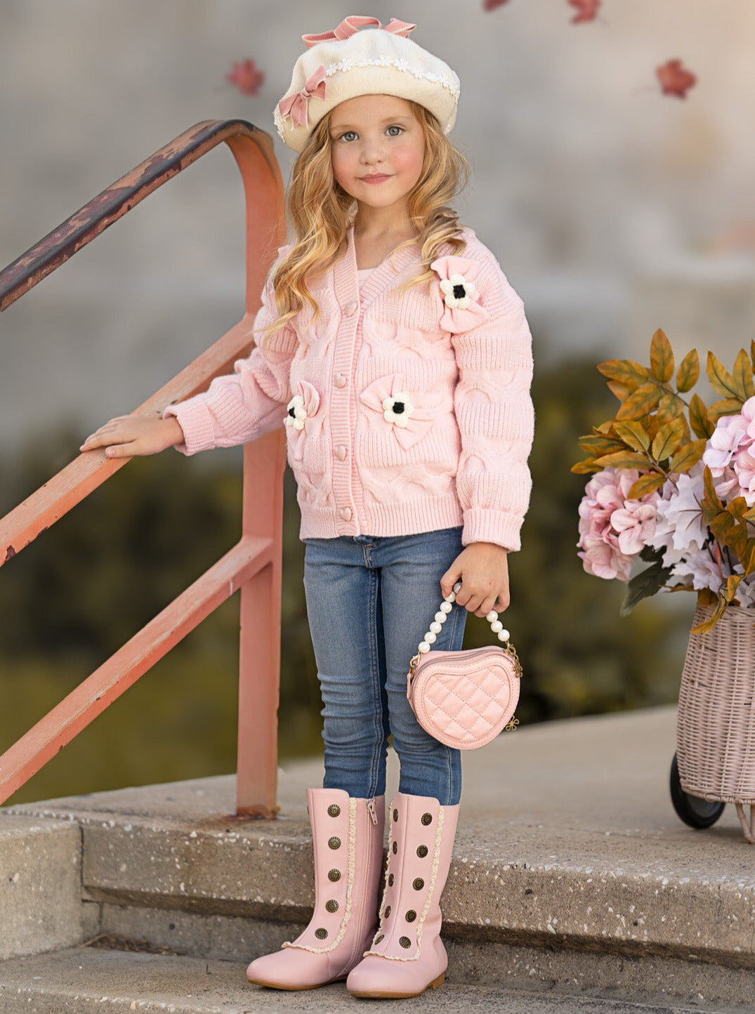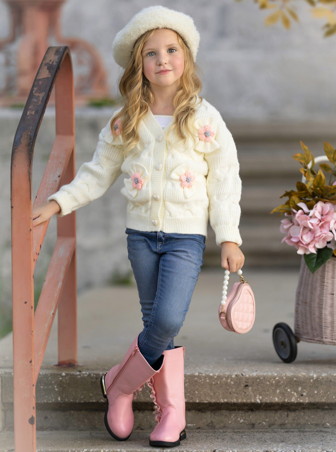 - This Girls Floral Button-Up Cardigan features charming knitted flowers, adding a cute and playful touch to any outfit.