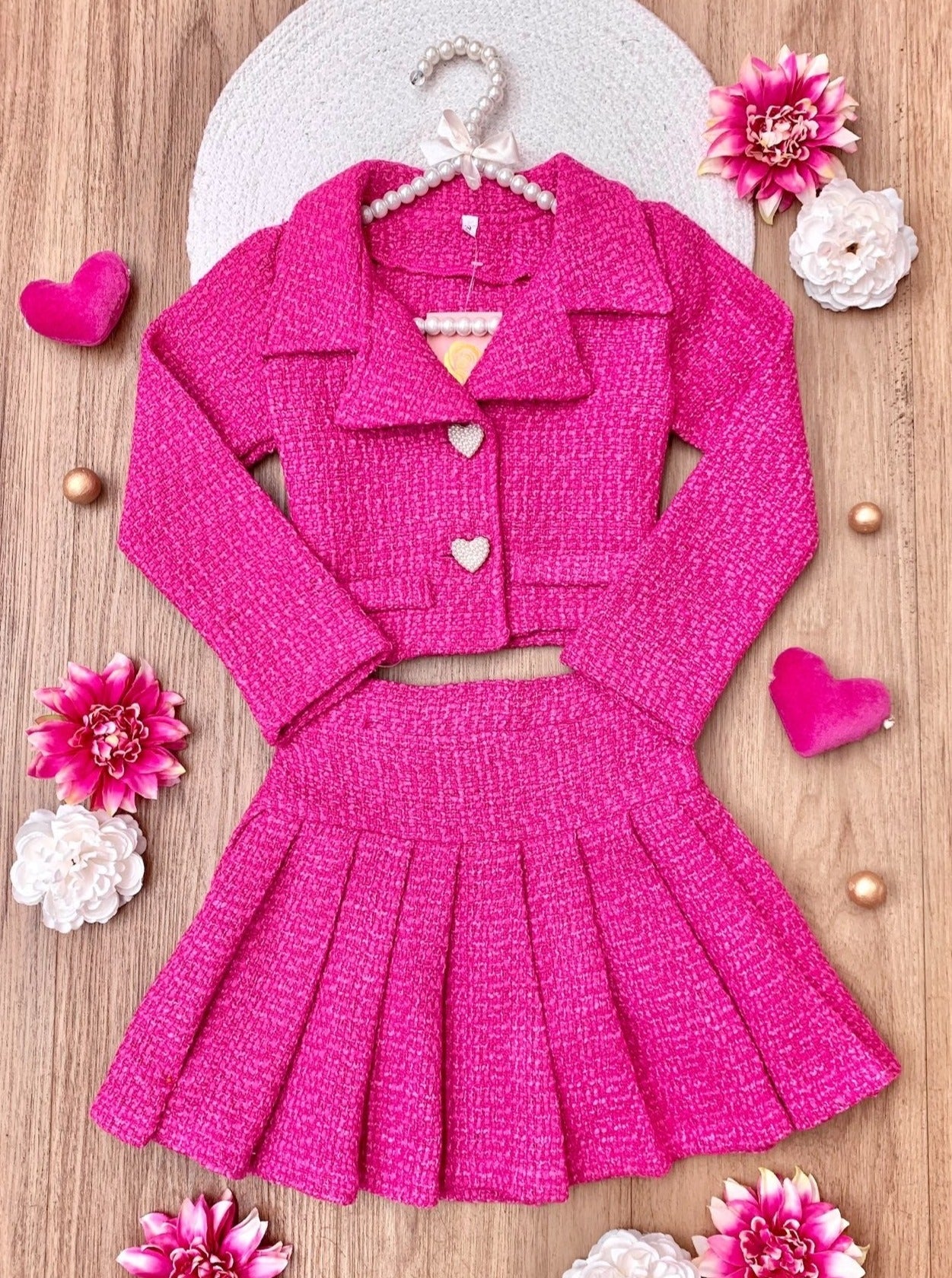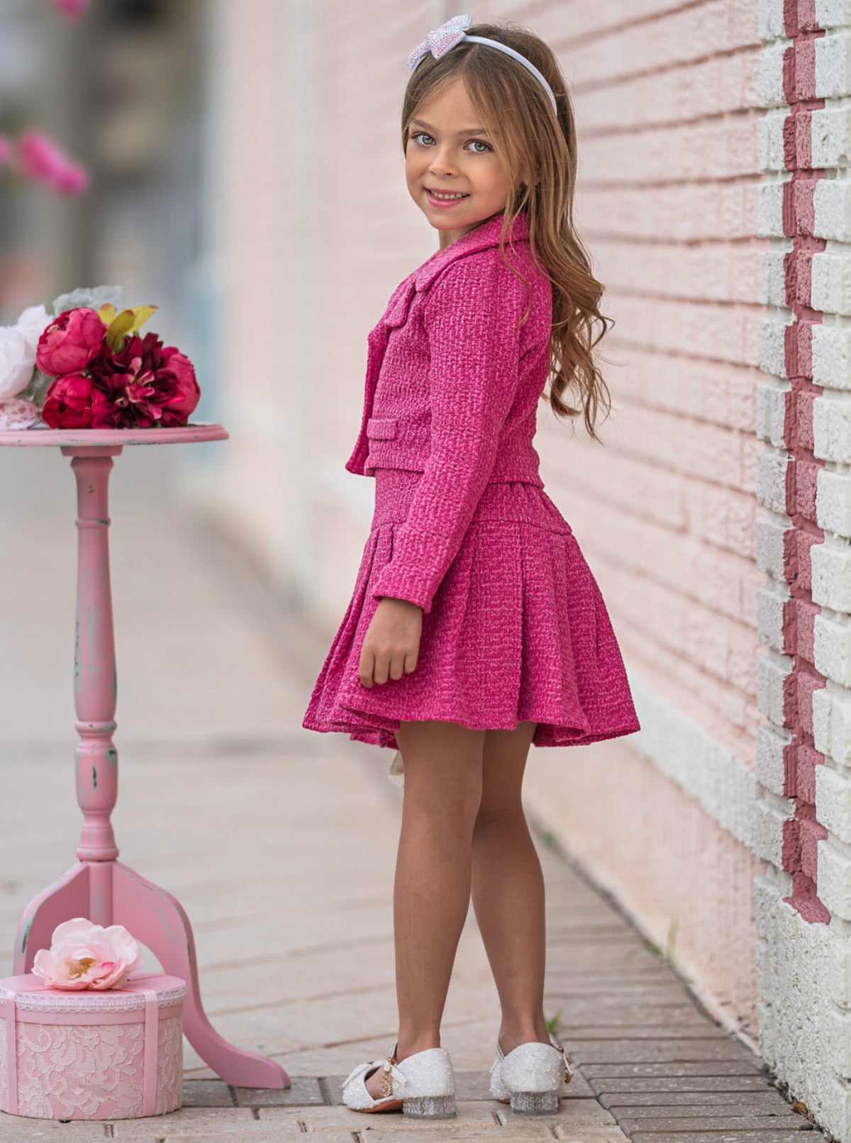 - Power suiting with our pink blazer and pleated skirt set is always a good idea. This chic pairing will have your little girl feeling like a boss. Empowered, stylish, and ready to have fun!