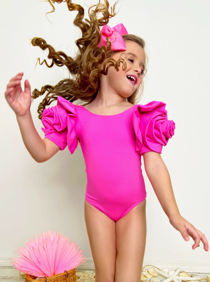 • Looking for a showstopper? This pink one piece swimsuit is perfect for your little fashionista to make a huge splash poolside or on the beach. The handcrafted rose sleeves put the diva in this swimsuit, and the stretchy, soft material is just so comfy to wear.
