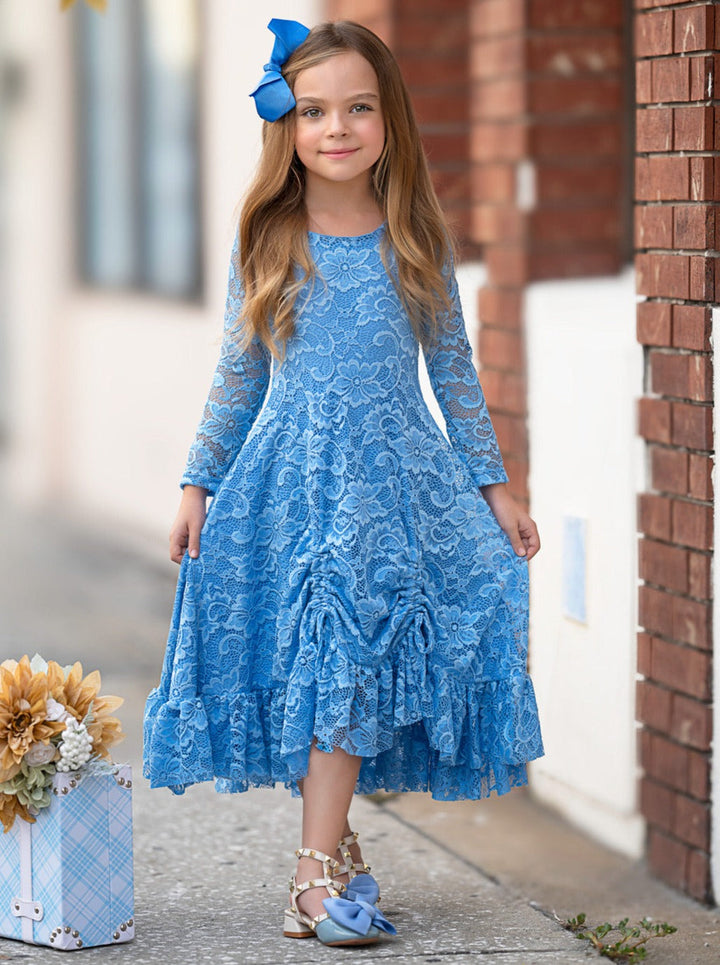 Our blue hi-lo drawstring lace ruffle dress will be your little girl's new favorite outfit. So elegant and ideal for any special occasion. We know she'll love it!