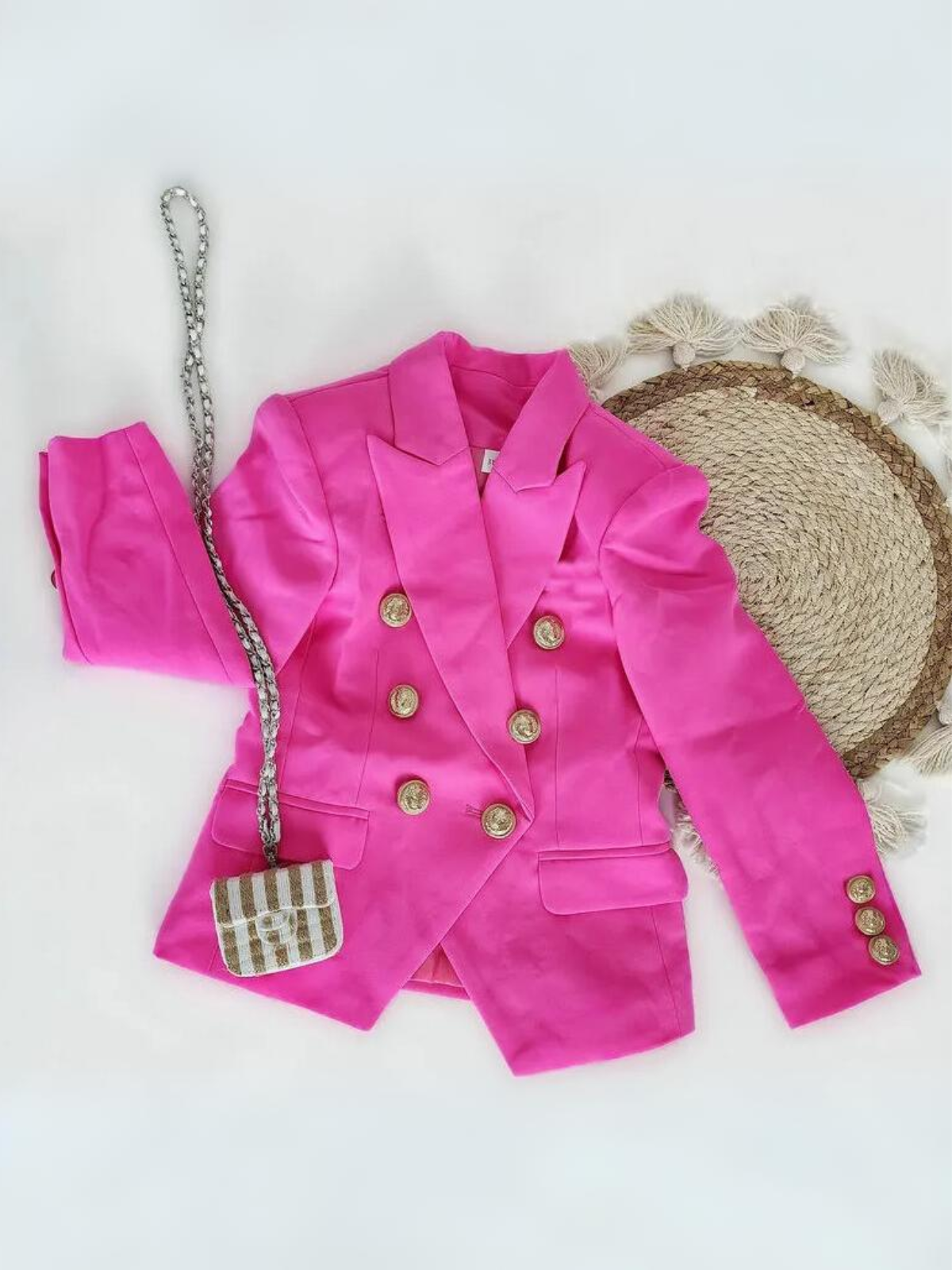 - Hot pink double-breasted blazer jacket with goldtone button details and faux pockets
