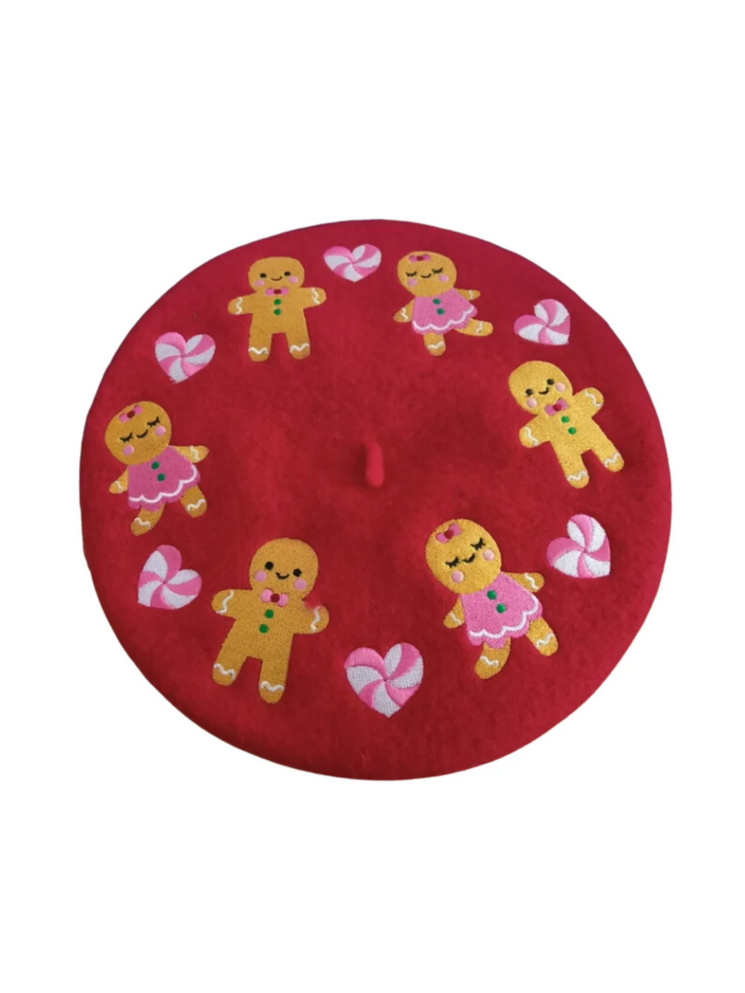 Decorated with delightful embroidered gingerbread men, peppermint hearts, and other charming holiday details, this beret captures the essence of the holiday season.