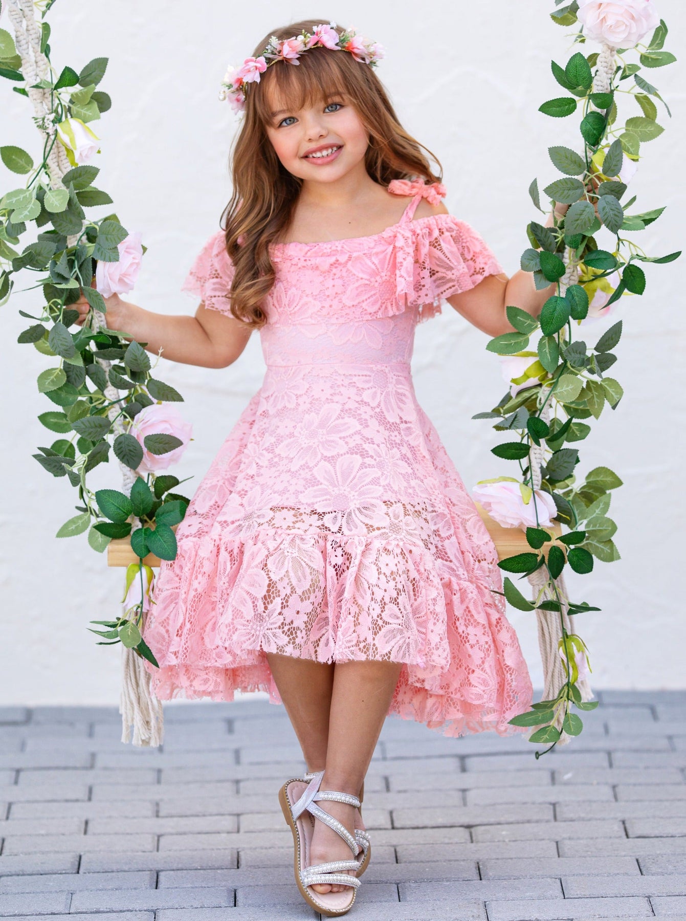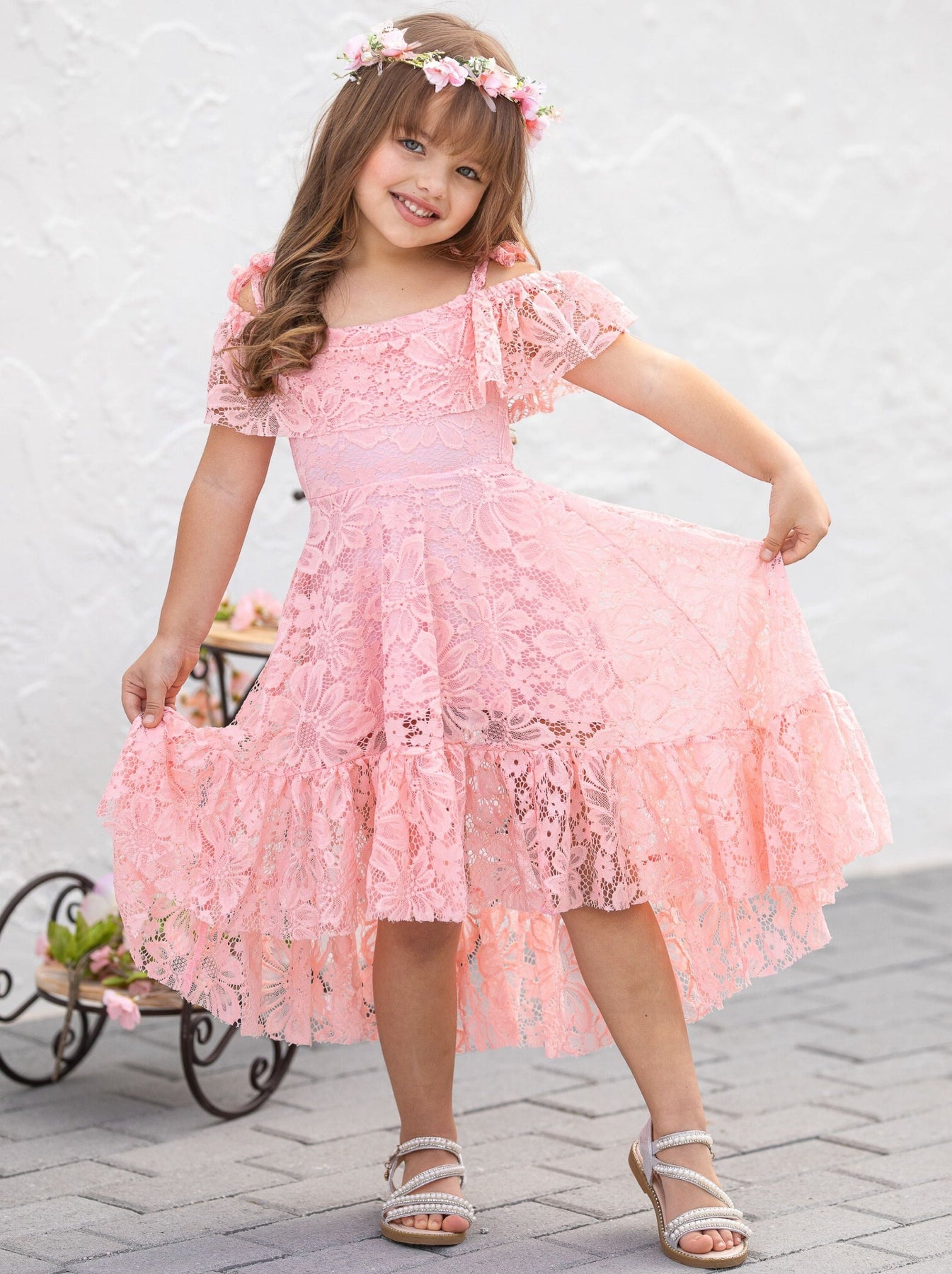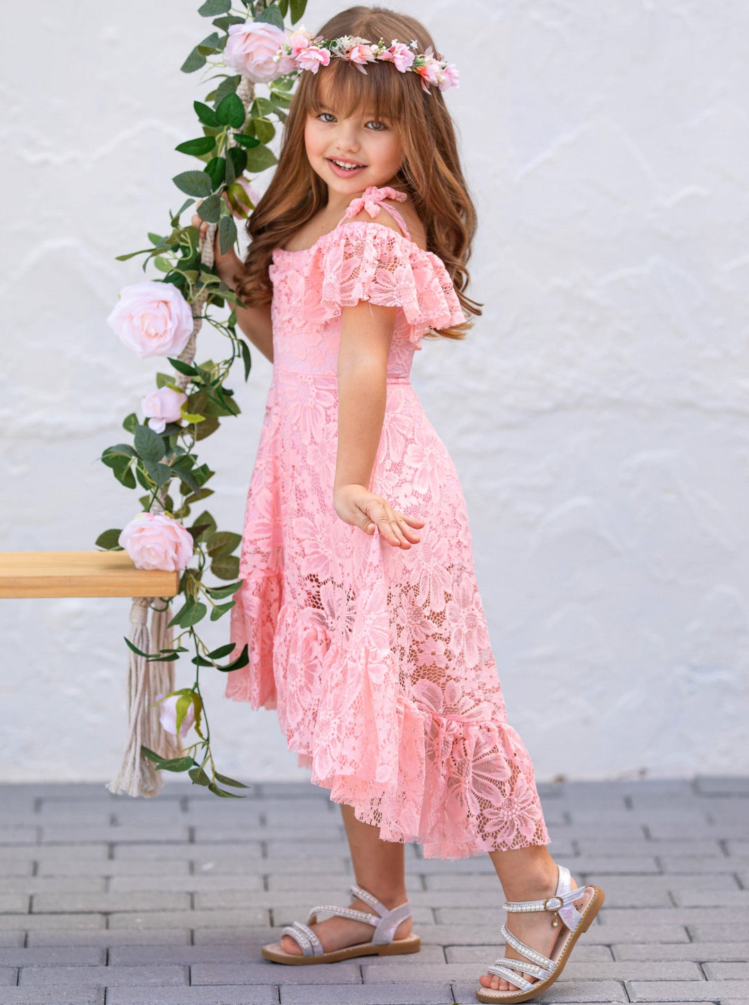 - THE prettiest dress of the season is here! Our pink lace maxi sundress has all the right details - a cold shoulder style, cute tie straps, and a ruffled hi-lo hem that make it the most snag-worthy "IT" dress for your precious one. Grab it while you can!