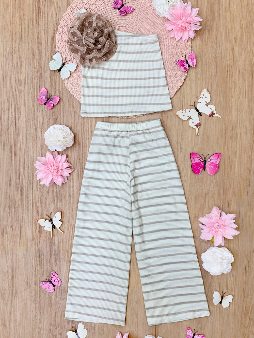 - This trendy set features a strapless top with rosette detail and wide-leg pants, both adorned with soft neutral stripes for a timeless look.