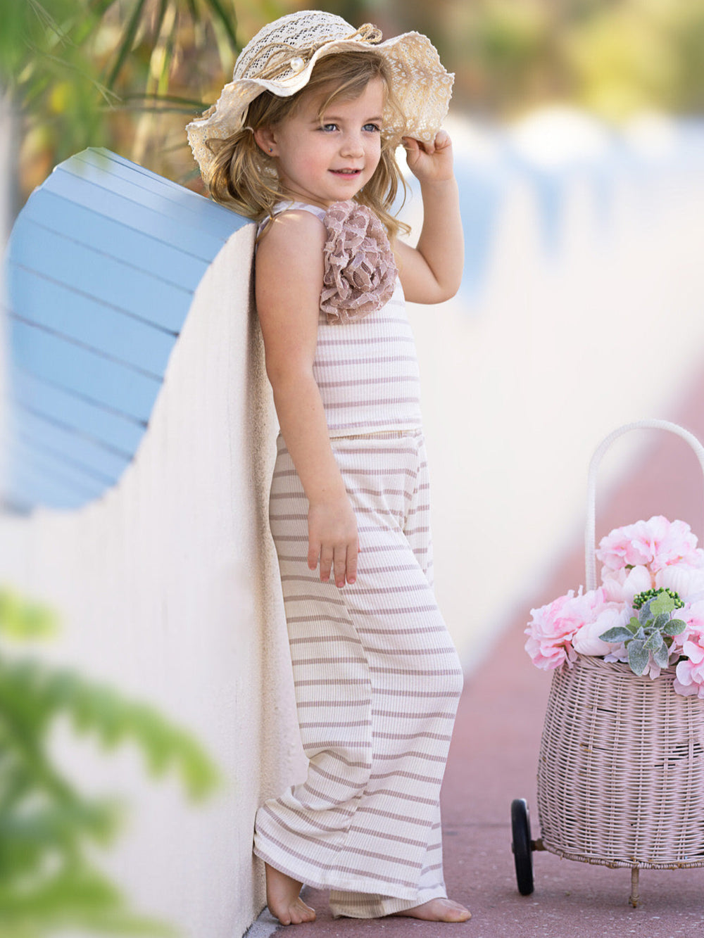 This trendy set features a strapless top with rosette detail and wide-leg pants, both adorned with soft neutral stripes for a timeless look.