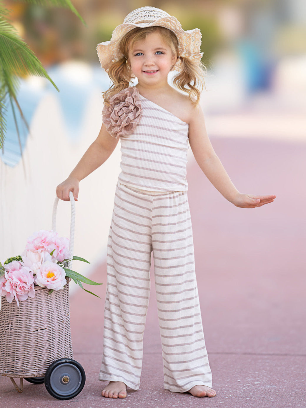Keep her effortlessly stylish with the Chic Beige Stripe One Shoulder Palazzo Pants Set, perfect for casual outings or cozy days at home.
