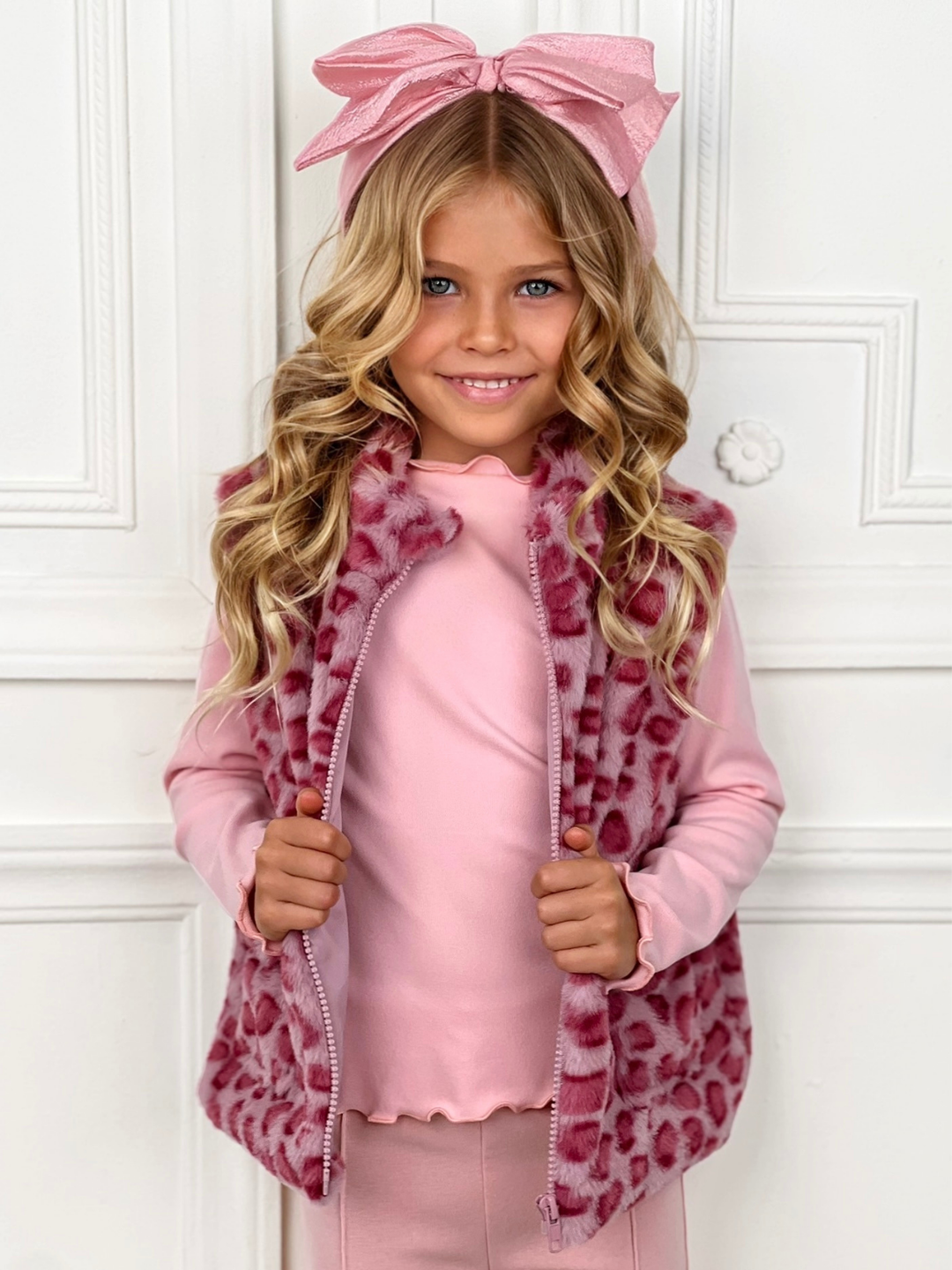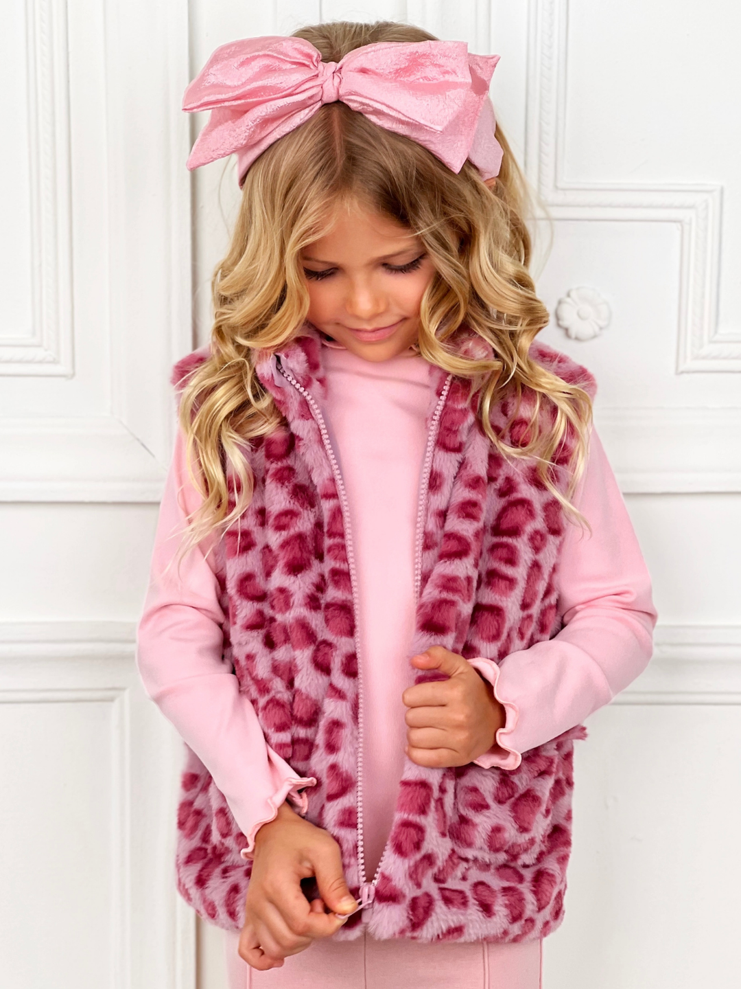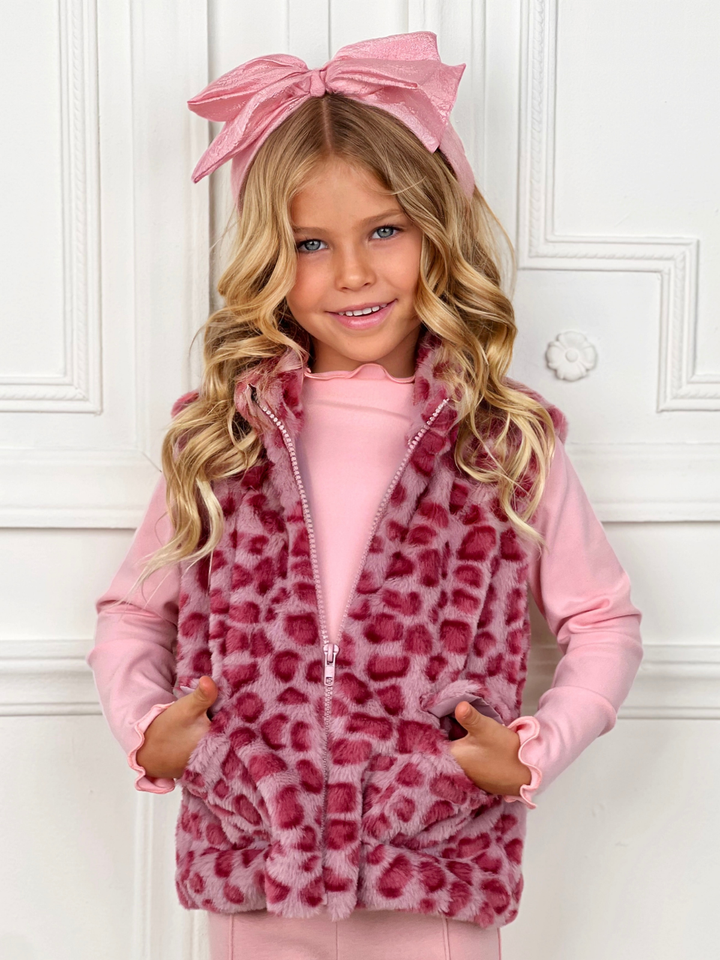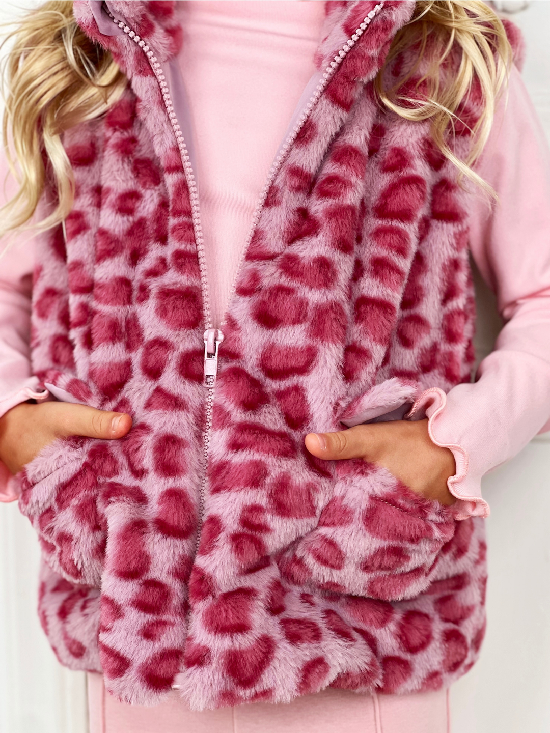 • Features a plush faux fur vest in a bold pink leopard print with a front zip and two side pockets for extra warmth and cuteness.
