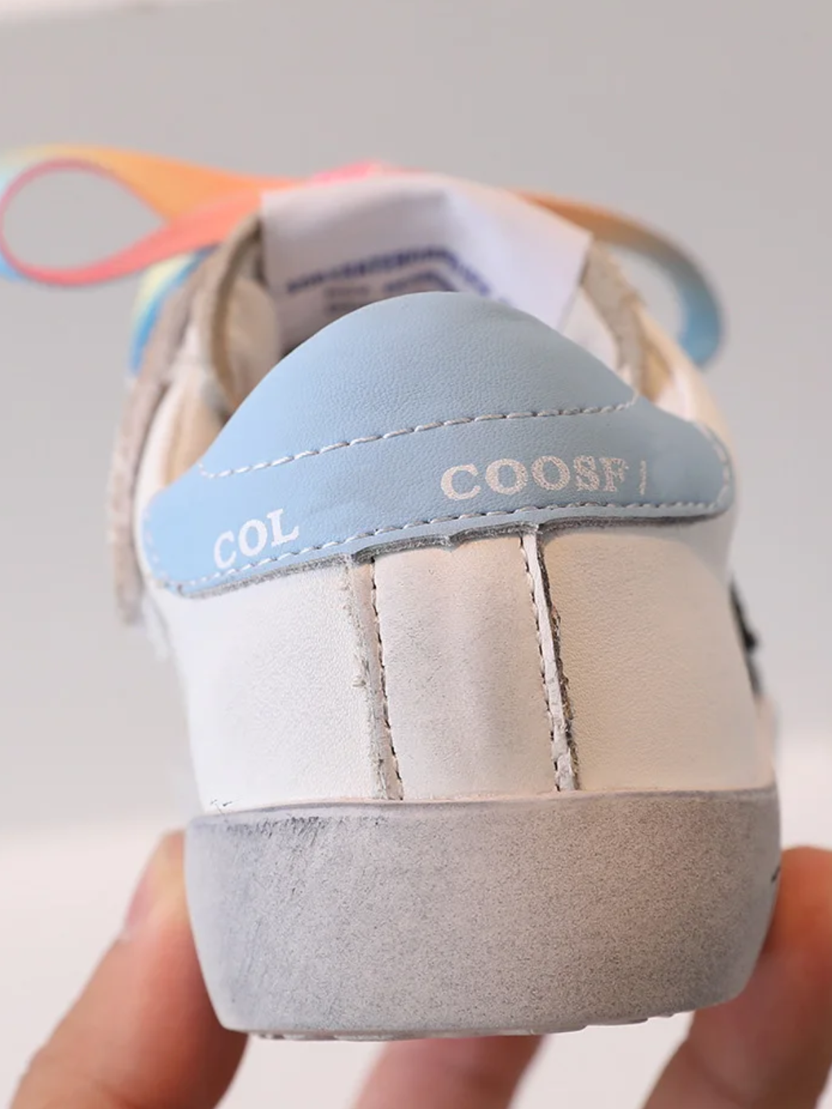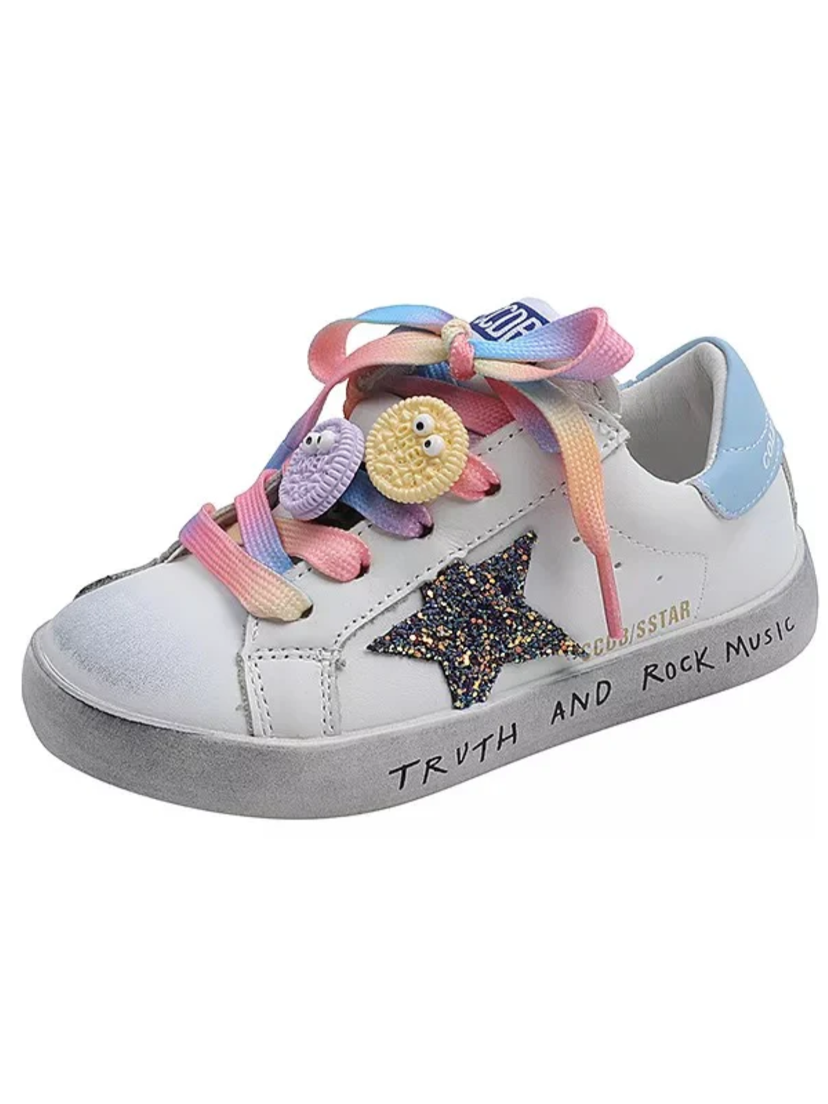 For the little artist with a bright personality, these distressed white sneakers are just the perfect pair! It has a uniquely worn look, decorated with colorful charms and cute laces. Because creative minds deserve the coolest kicks!