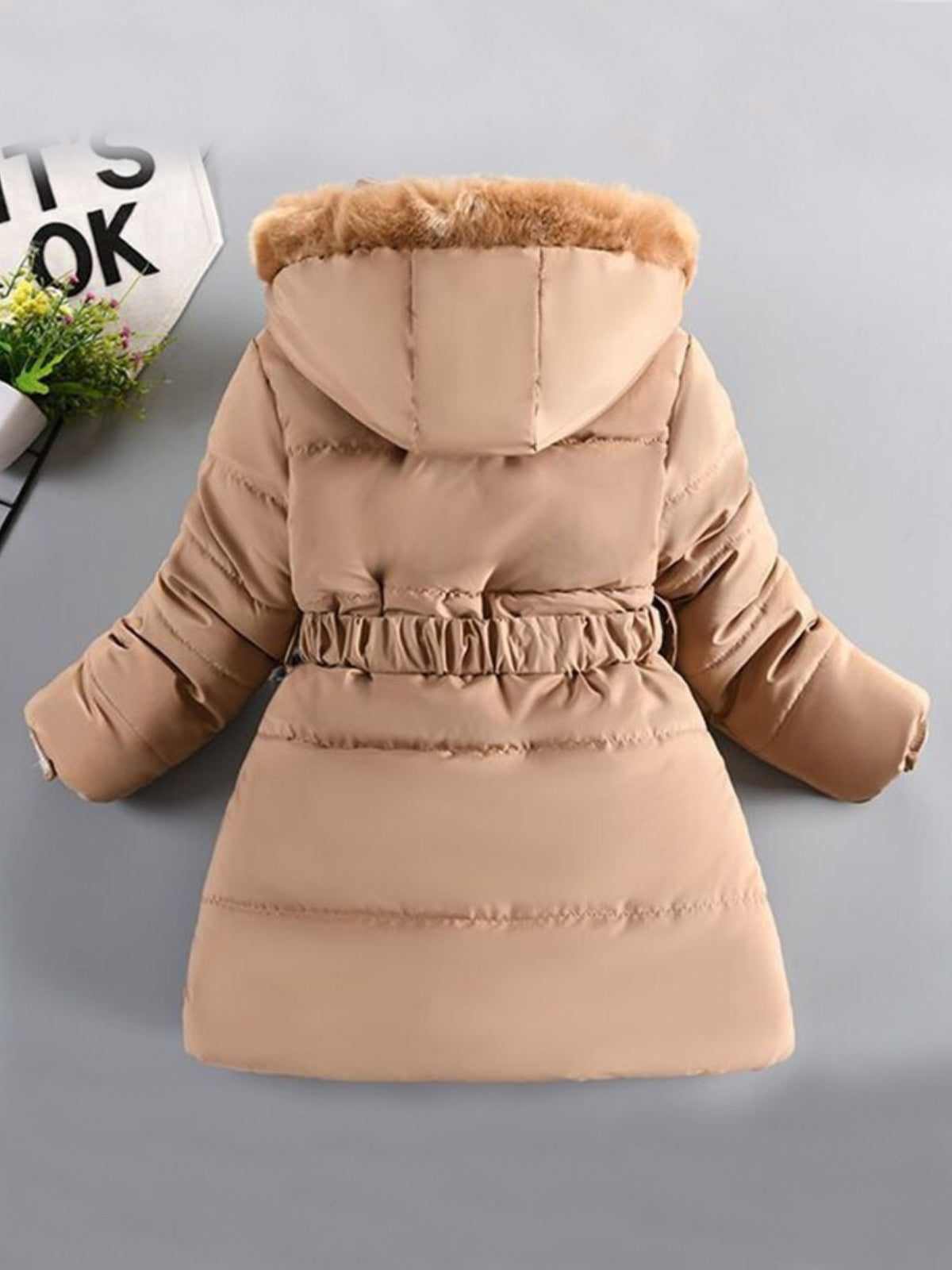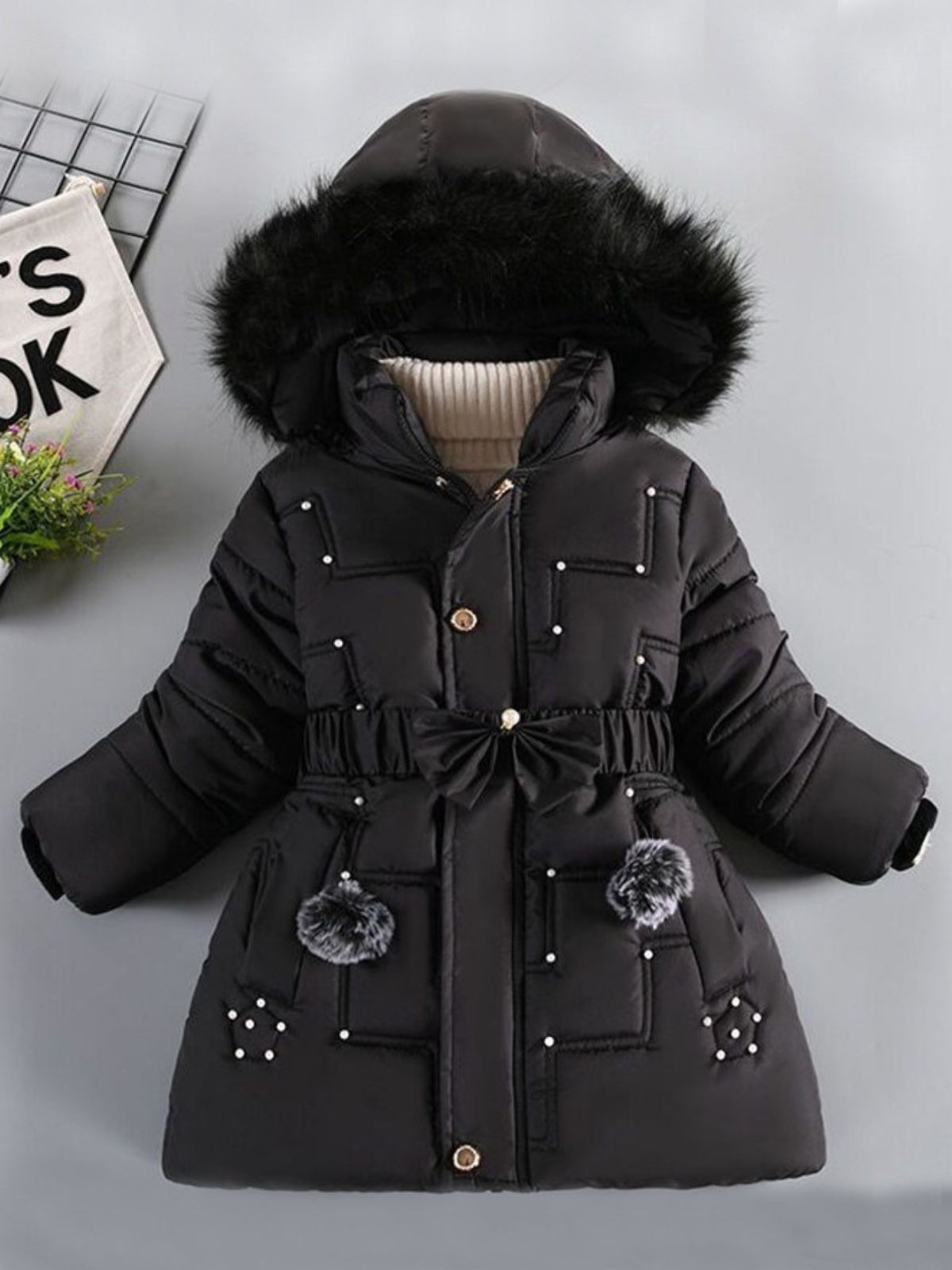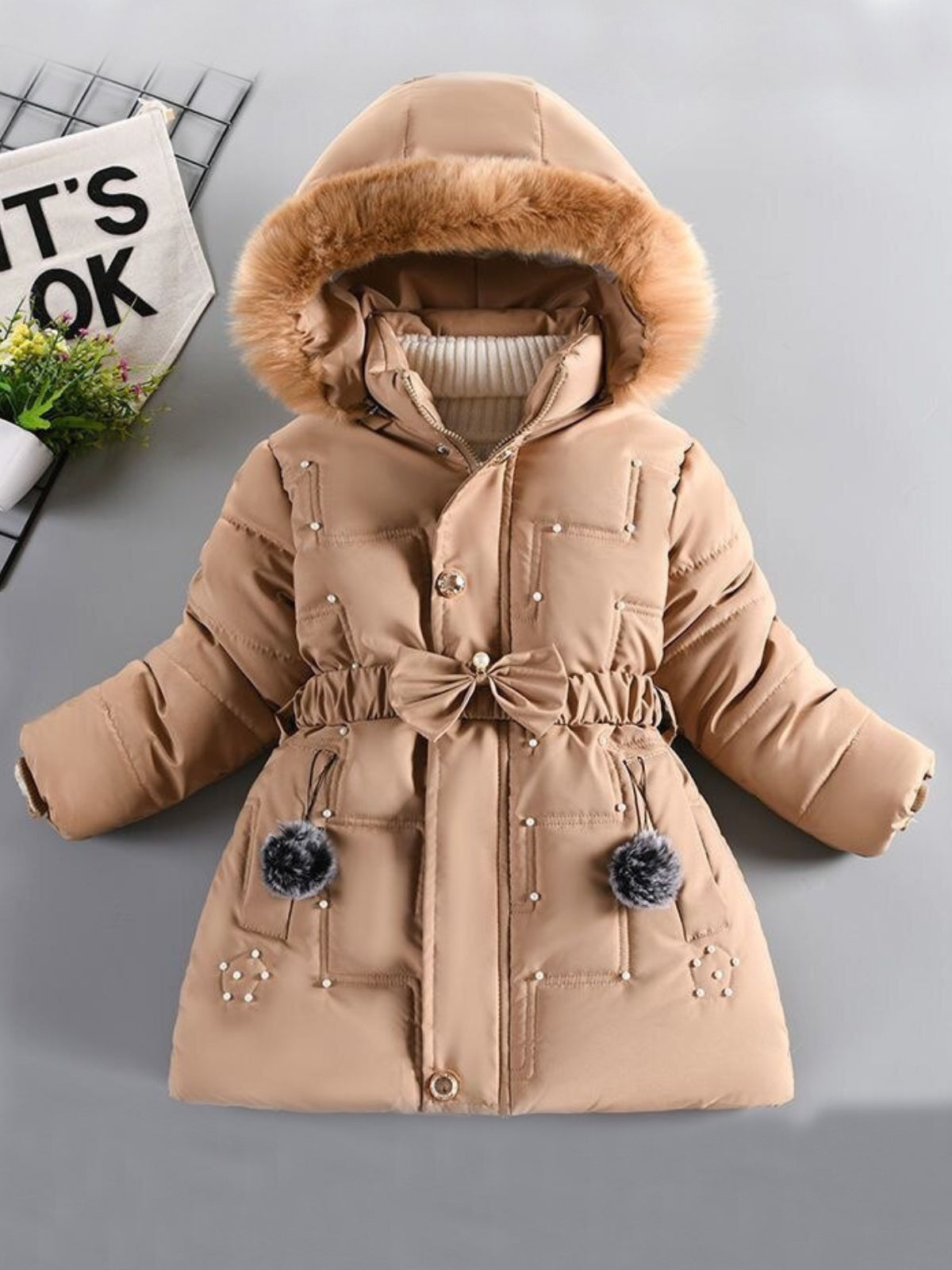 Add a touch of girly vibe to her winter wardrobe with our pearl embellished winter jacket. This lovely piece will impress your princess with its chic details and classy look. Finished with a fur-lined hoodie and detachable belt for extra fashion flair!