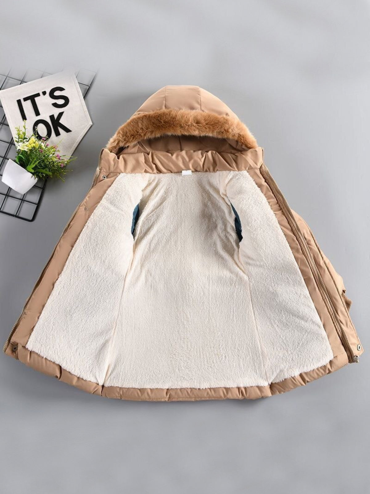 Winter jacket with fur hoodie, pearl details, side pockets, and pom pom accents
