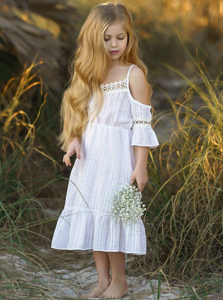 Your spring princess will never want to take this delicate cold-shoulder maxi dress off! Featuring charming details like ruffled lace trim and cute flower embroidery, it's the perfect boho dress for your little sunshine. Wear it with casual sandals for an adorable spring/summer outfit.