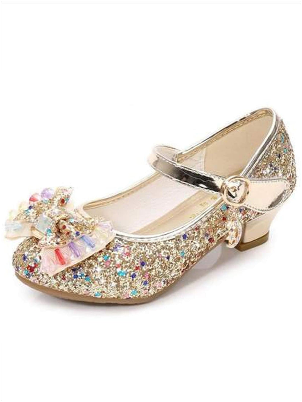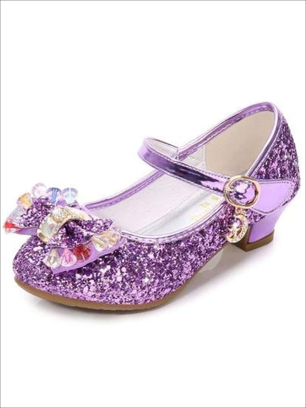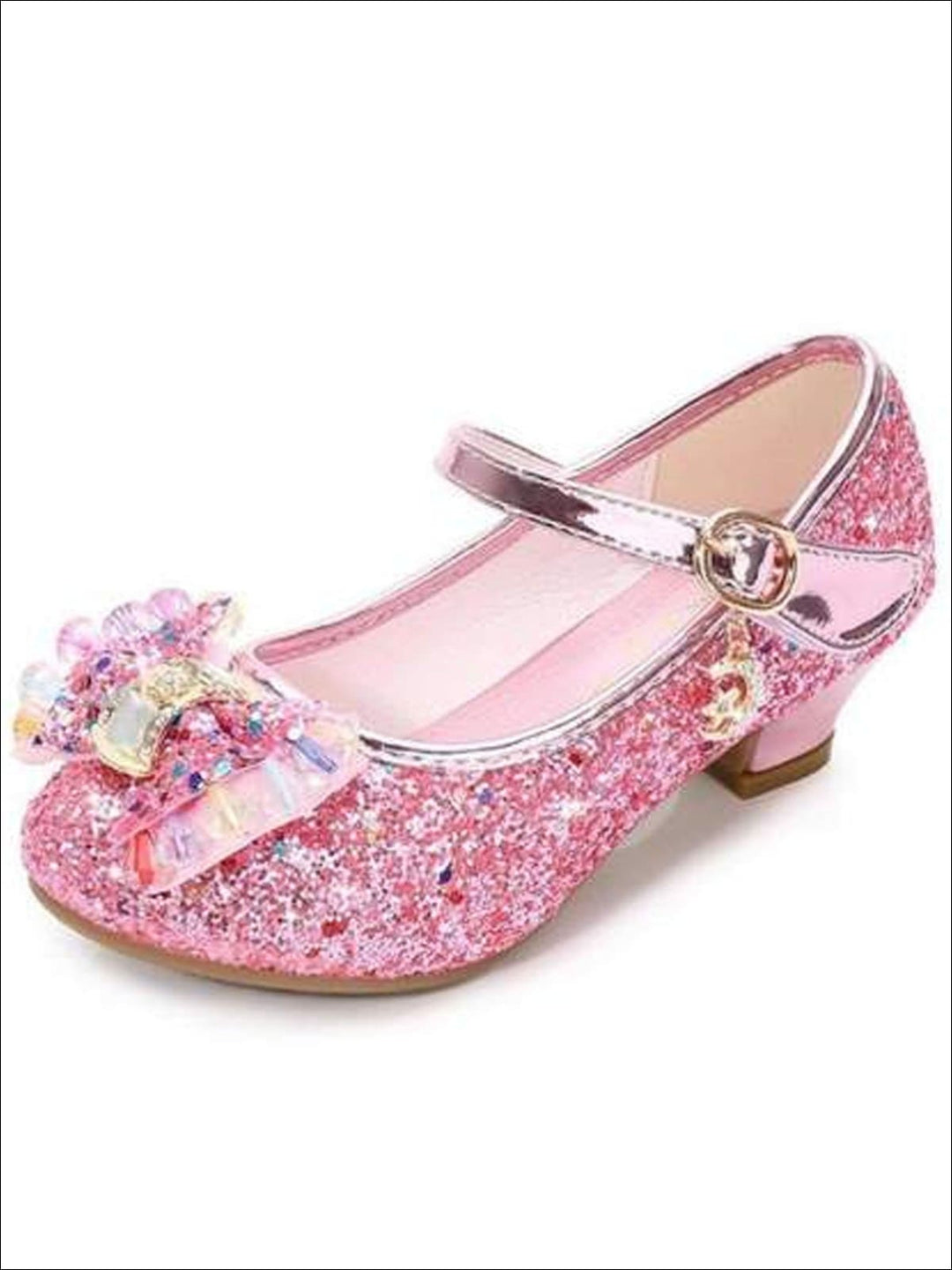 - Serve up some sparkle and charm with these shimmery glitter-covered princess shoes with a mini heel for added grace. Bedazzled with a large gem bow tie across the toes and an easy-on velcro ankle strap, your little girl can dance the night away in style.