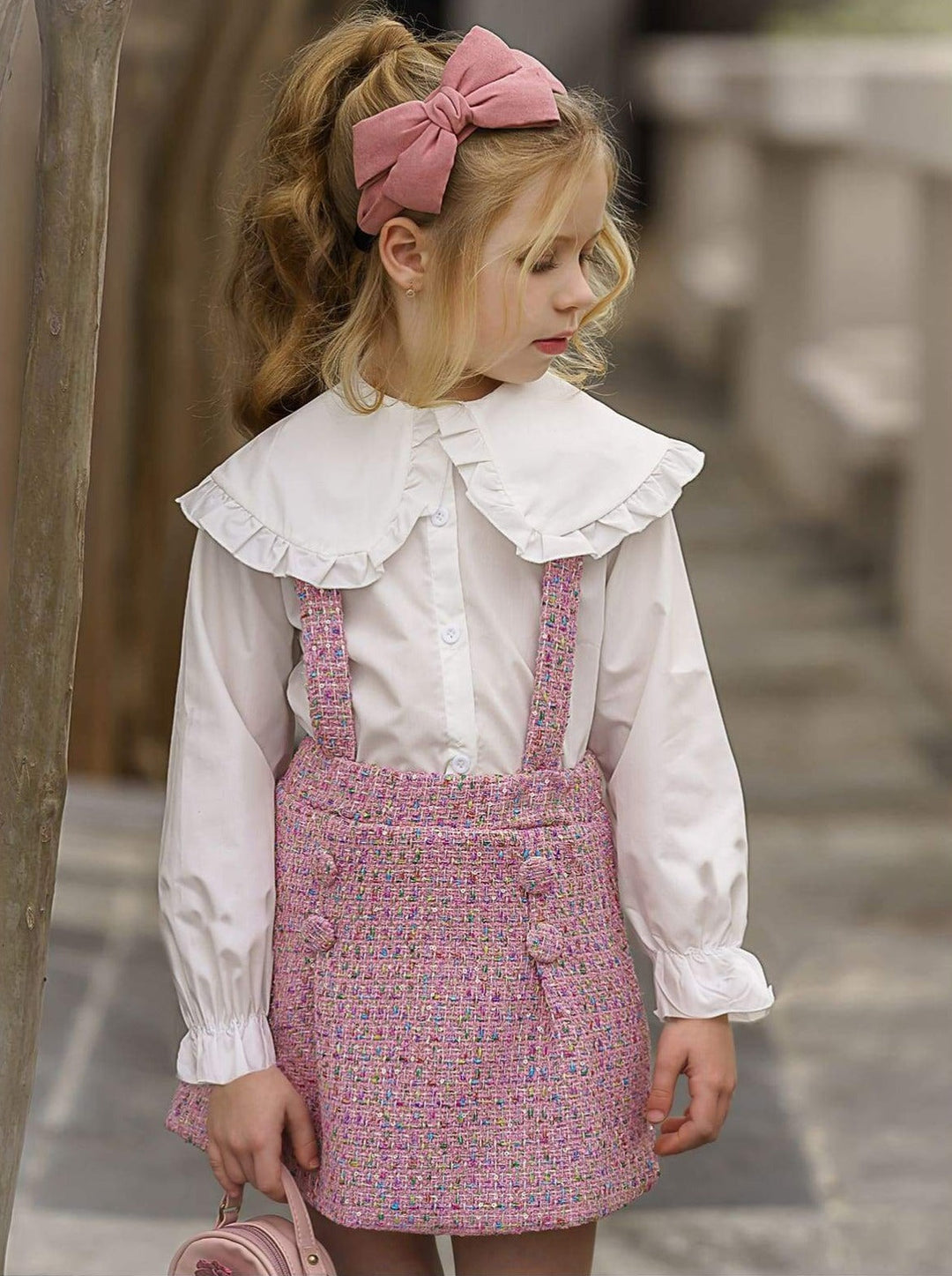 Long sleeve ruffled bib button-down blouse and tweed overall skirt with cross-back suspenders