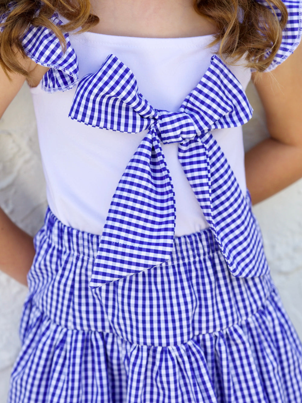 - Features a crisp white top with ruffled gingham straps and an oversized bow for a cute, country-inspired look