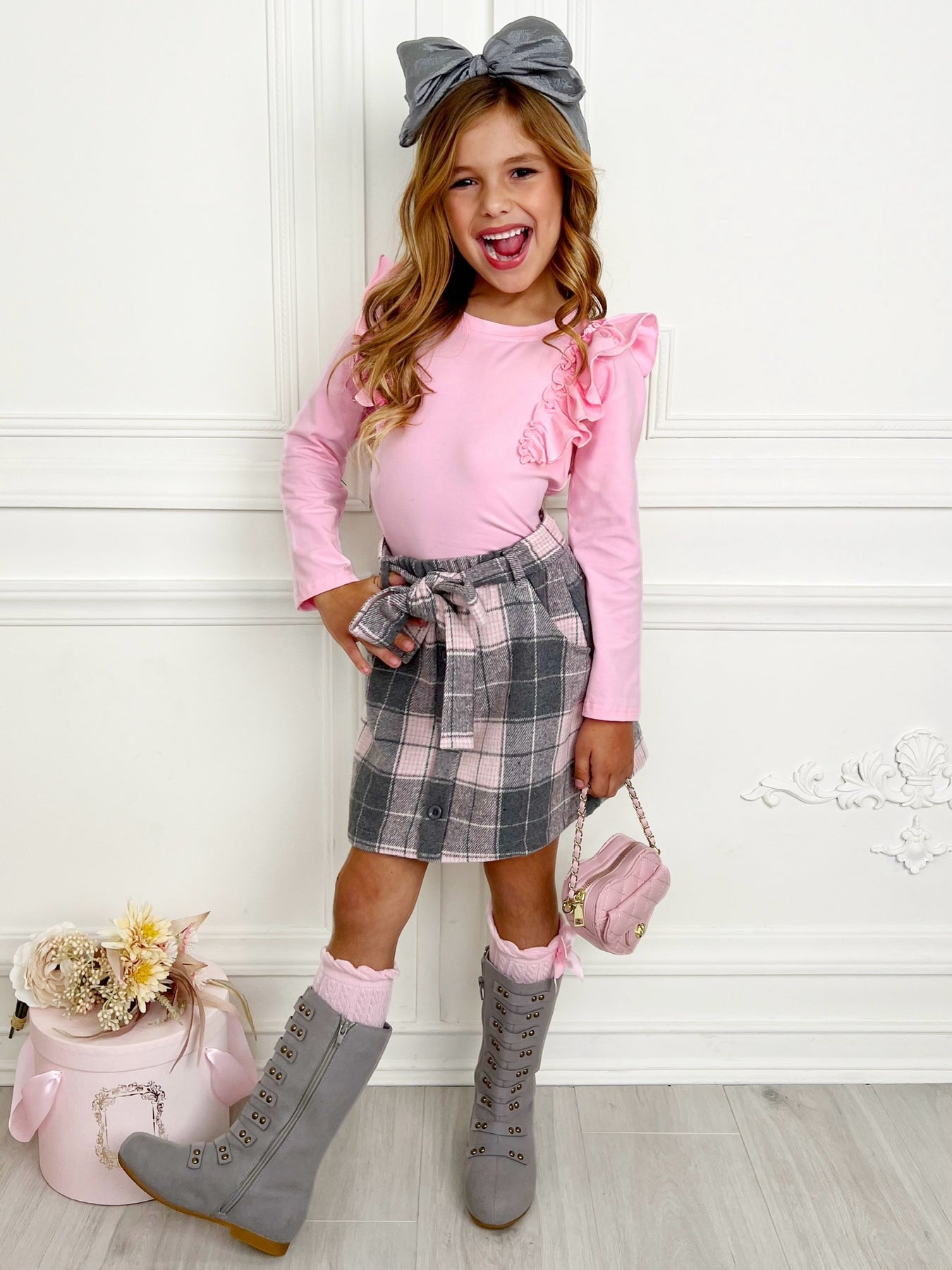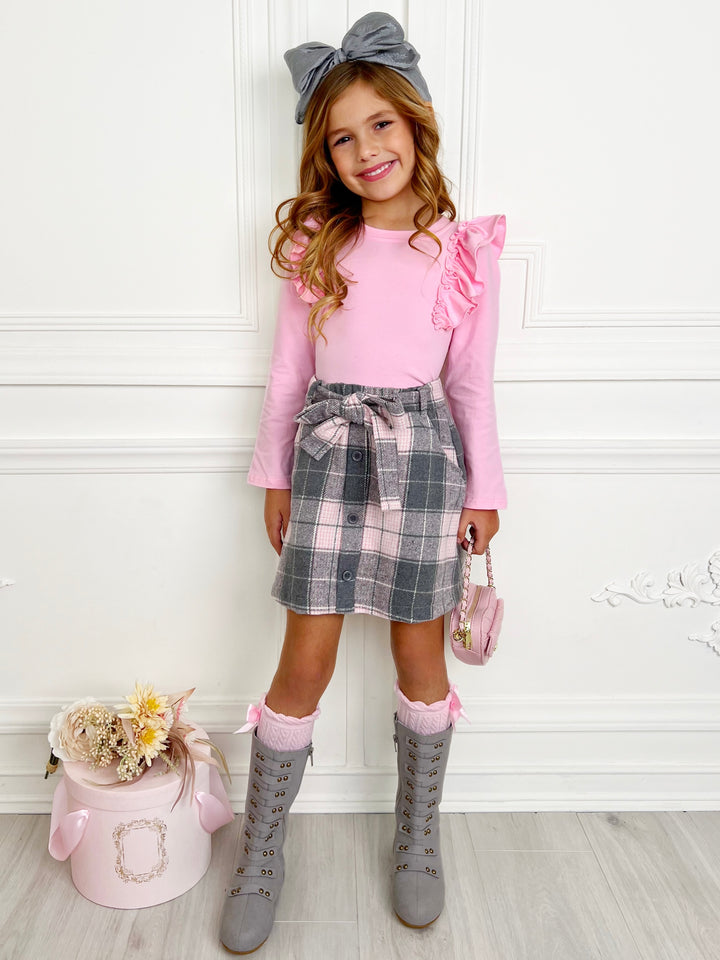 • Elevate your little girl's wardrobe with our Pink Ruffles Top and Plaid Delight Girls Skirt Set, perfect for any occasion.