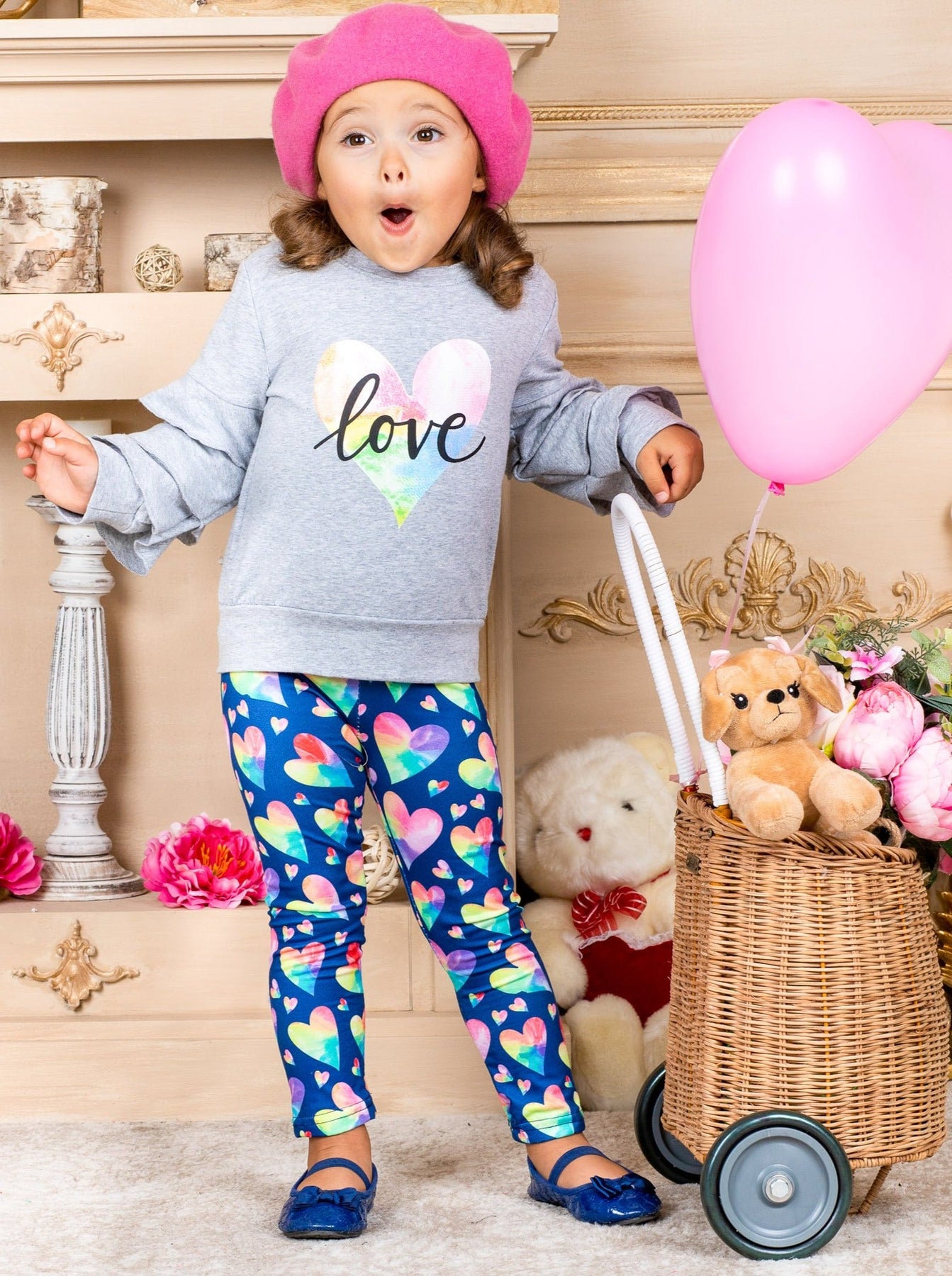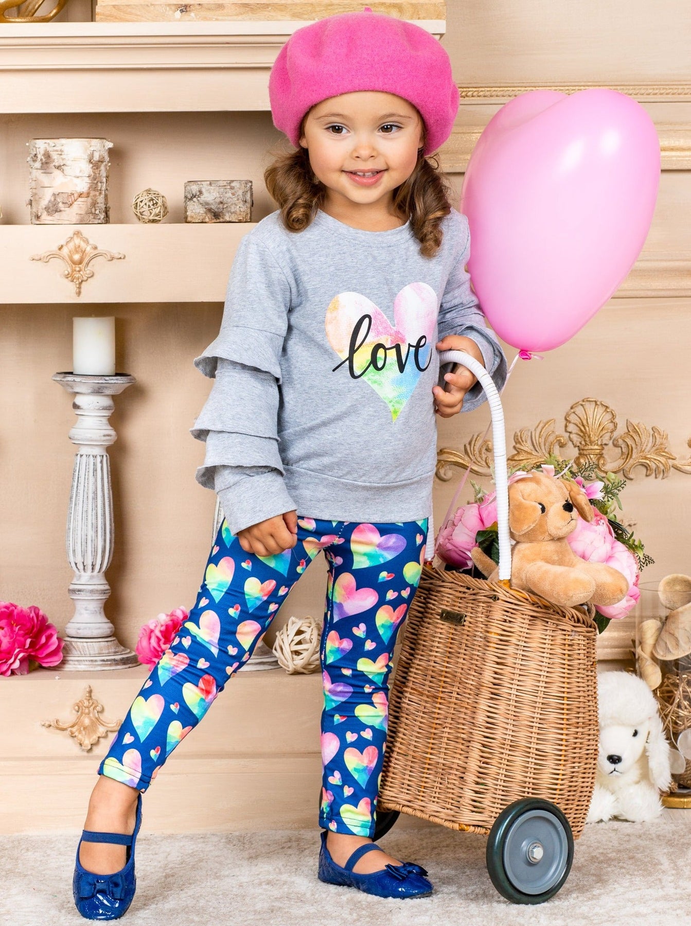 - Long-sleeve top with tiered ruffled accents "Love" and rainbow heart graphic and tie-dye heart print and heart printed leggings