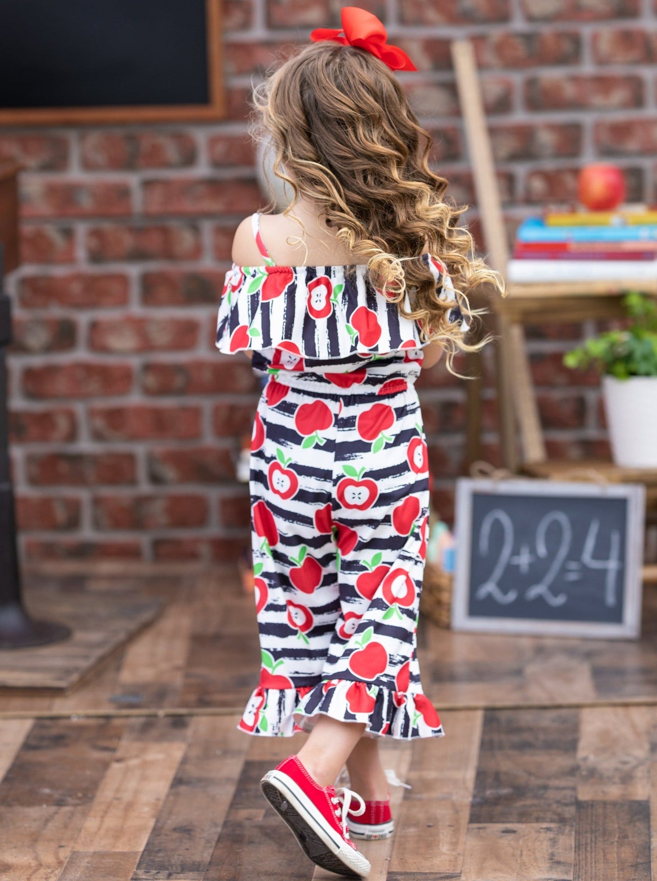 Come through, cuteness! Aren't these stripes, apples, and ruffles EVERYTHING? This chic, sleeveless jumpsuit will have your girl's teacher so impressed on her first day back to school.