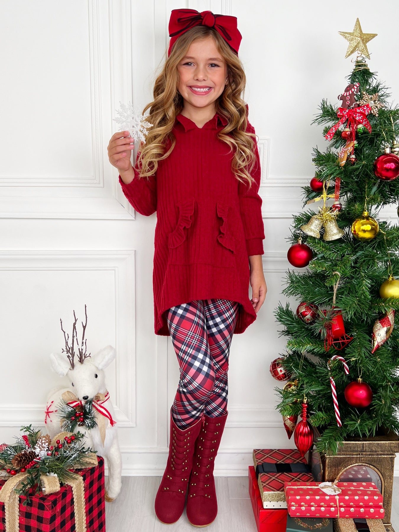 The set features a ribbed red hooded tunic with adorable ruffle details and practical front pockets, paired with plaid-print leggings in festive red and navy hues.