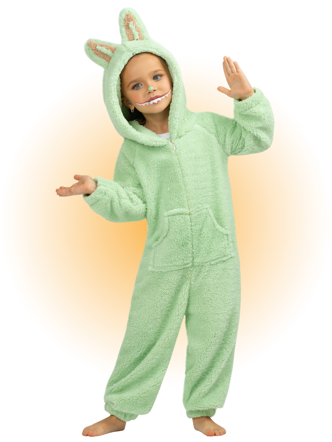 • Snuggle into sweet silliness with this ultra-soft onesie inspired by everyone's favorite mischievous forest critter! This green fuzzy costume is a playful nod to a certain collectible creature with a toothy grin and wild imagination—perfect for girls who love cute with a little twist of quirky.